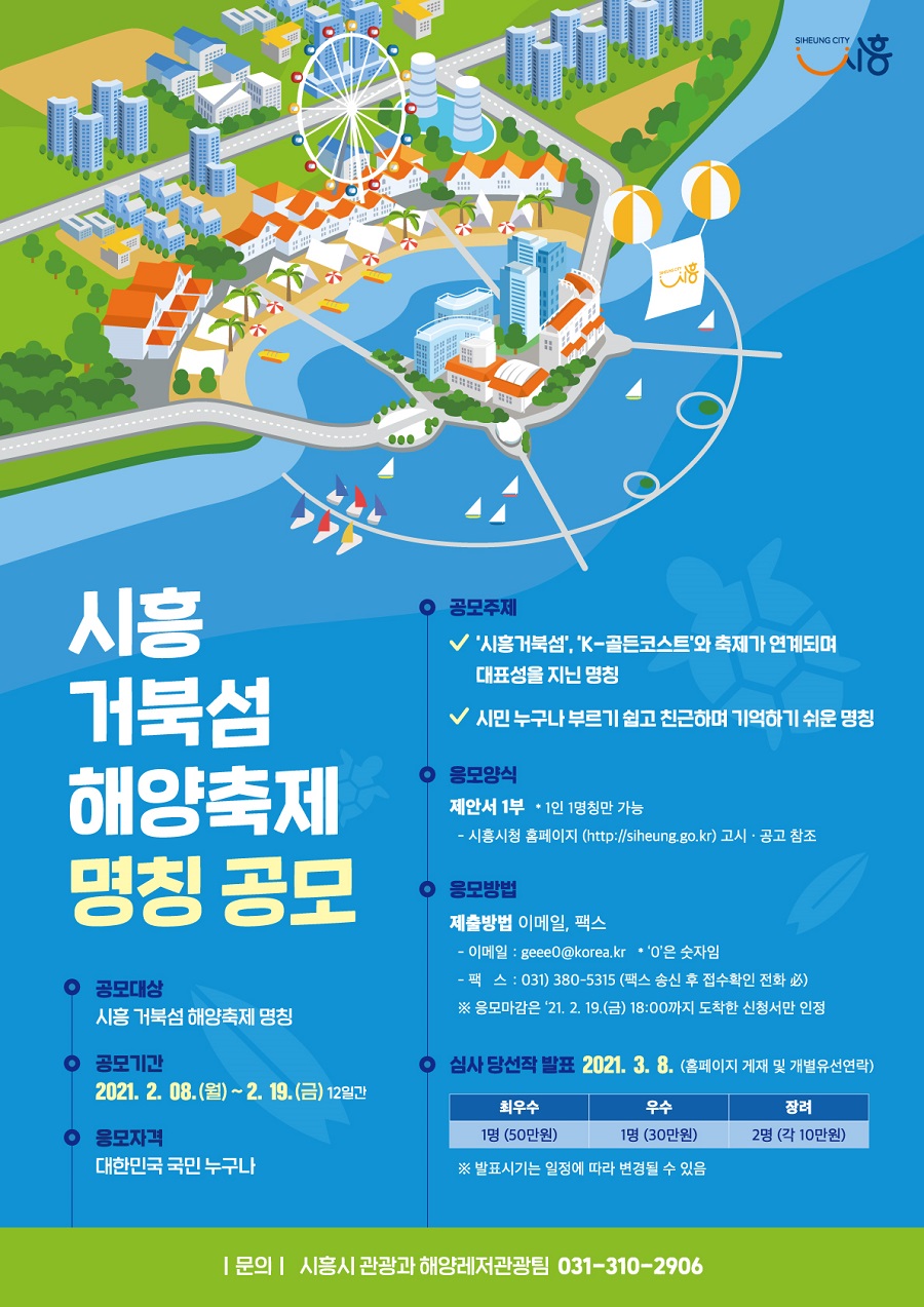 시흥시(시장 임병택)가 2월 8일부터 19일까지 12일간 ‘시흥거북섬 해양축제’의 명칭을 공모한다. 첫 축제의 장을 여는 만큼 시민들의 관심도를 높이고, 시흥거북섬을 널리 알리기 위해서다.