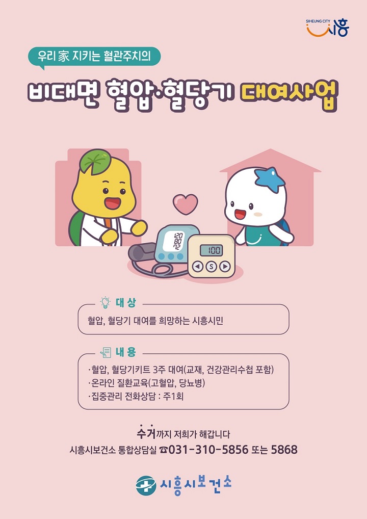 시흥시(시장 임병택)는 고혈압·당뇨병 고위험군과 초기 환자에 선제적으로 접근하기 위해 비대면 혈압·혈당기 대여사업을 운영한다.