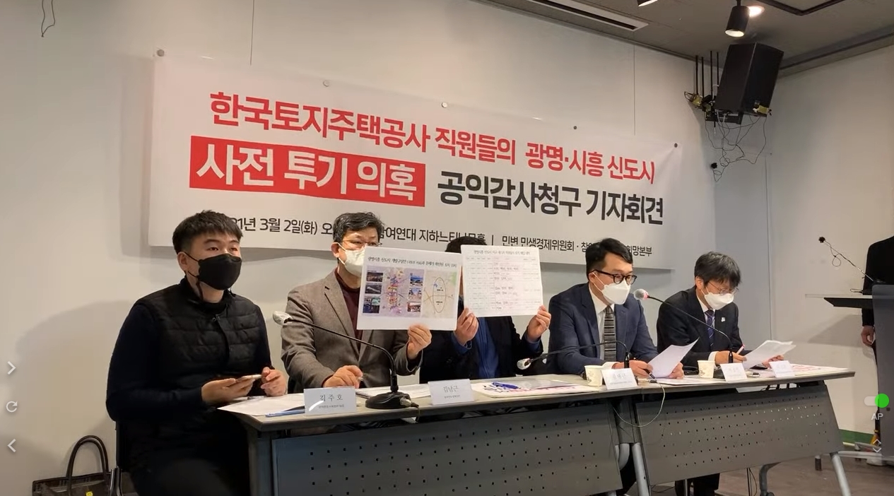 민변 민생경제위원회와 참여연대 민생희망본부는 2일 오전 참여연대 지하 느티나무홀에서 온라인 기자회견을 열고 “2018년부터 2020년까지 3년간 LH 직원들이 구입한 해당필지 토지 등기부등본과 LH 직원 명단을 대조한 결과, 토지 쪼개기 매입한 정황을 확인했다”면서 “10여명의 LH 직원과 그 배우자들이 총 10개의 필지, 2만3028㎡, 약 7천 평의 토지를 매입한 가격만 100억 원대에 달하며, 금융기관을 통한 대출액만 약 58억 원에 이를 것으로 추정했다.”고 밝혔다.