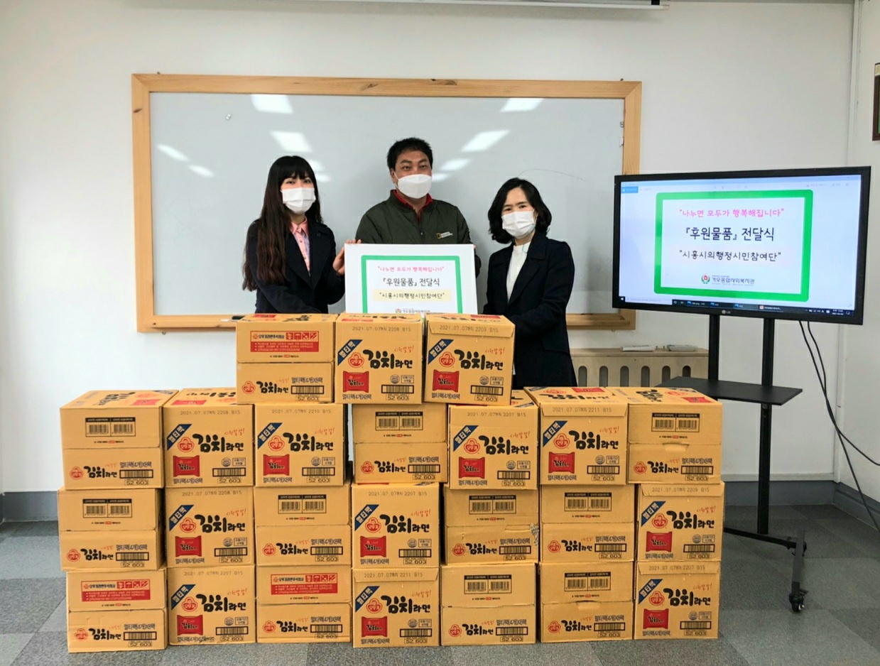 이 소식을 접한 시흥시의정행정시민참여단(단장 최민천, 이하 의행단)은 9일 오전 11시 30분에 거모종합복지관에서 시흥시의회 박춘호 의장과 거모복지관 관장이 참석한 가운데 라면 40박스를 후원했다.