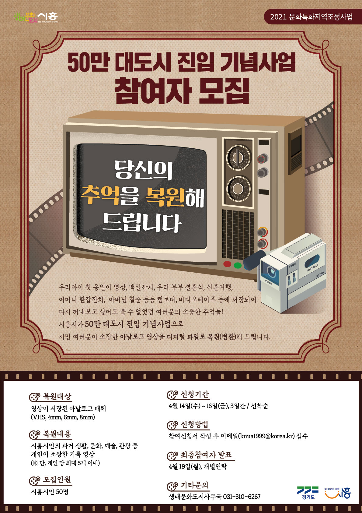 이에 시흥시가 시흥시민의 그리운 옛 추억을 찾아주기 위해 나섰다. 아날로그 영상 디지털 복원서비스 ‘당신의 추억을 복원해드립니다’ 사업 참여 신청기간은 4월 14일~16일까지 사흘간이다.