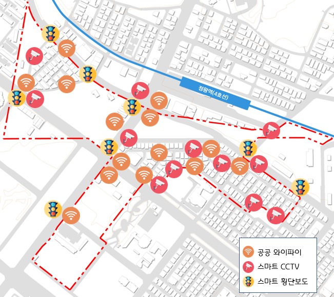 이와 함께 횡단보도 안전 문구를 표시하는 LED 전광판을 비롯해 무단횡단 경고 음성 안내 시스템이 반영된 스마트 횡단보도 또한 13개가 설치되었다. 늦은 시간 안심귀가를 위해 스마트폴을 활용한 안심 벨, 지능형 CCTV도 설치를 마쳤다.