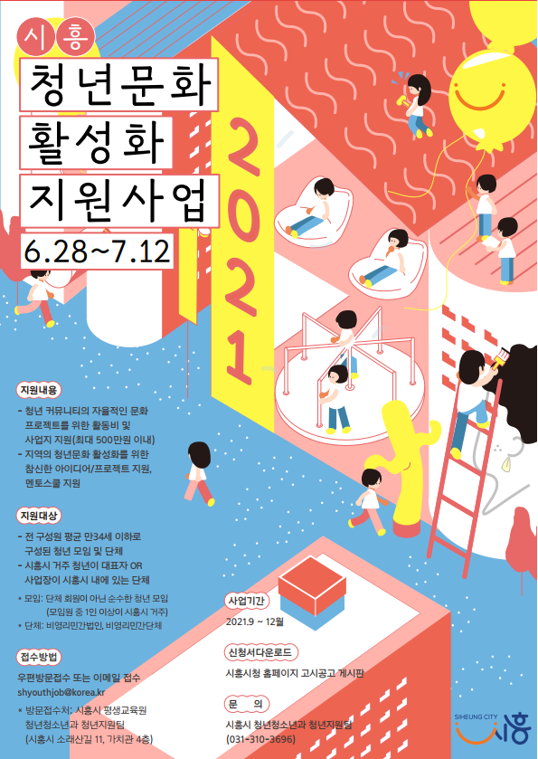 시흥시(임병택 시장)는 지역 청년 세대에게 창의적이고 실험적인 문화예술 활동의 기회를 제공하기 위해 6월 28일부터 7월 12일까지 <청년문화 활성화 지원사업>에 참여할 청년 단체를 모집한다.