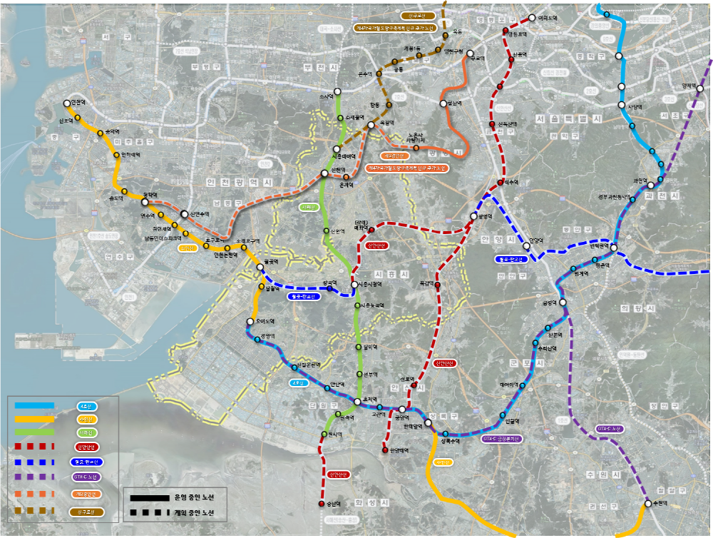 제2경인선은 인천 청학 에서 신천역을 지나 광명 노온사동으로, 신구로선은 시흥대야역에서 서울목동으로 연결된다.
