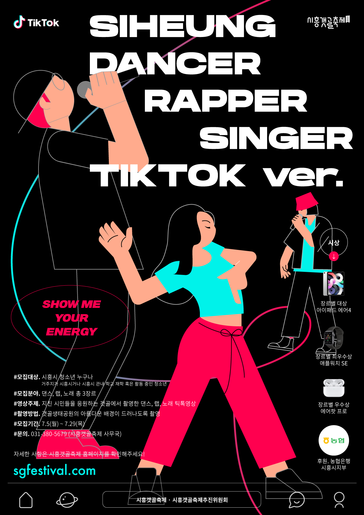 참여방법은 댄스, 랩, 노래 3가지 장르중 하나를 선택해 ‘코로나19로 지친 시민들의 마음을 위로하고 응원하는 영상’을 주제로 시흥갯골생태공원에서 개별 영상 촬영 후, 틱톡에 업로드 하면 된다.