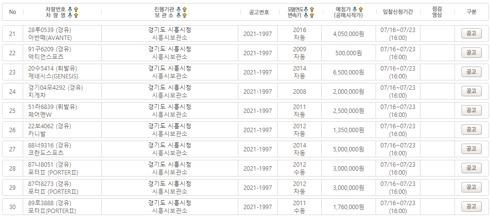 시흥시(시장 임병택)는 올해 세 번째로 7월 16일부터 23일까지 압류 자동차 40대에 대해 인터넷 전자공매 입찰을 실시한다고 밝혔다.