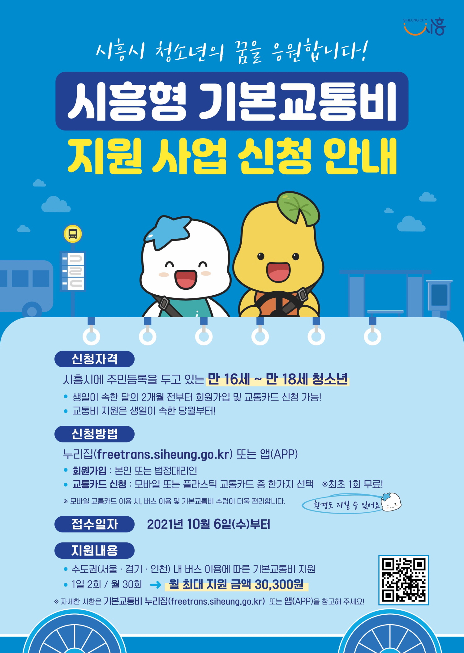 시흥시(시장 임병택)가 오는 10월 6일부터 만 16세~18세 청소년을 대상으로 ‘시흥형 기본교통비’ 지원 사업 신청 접수를 시작한다.