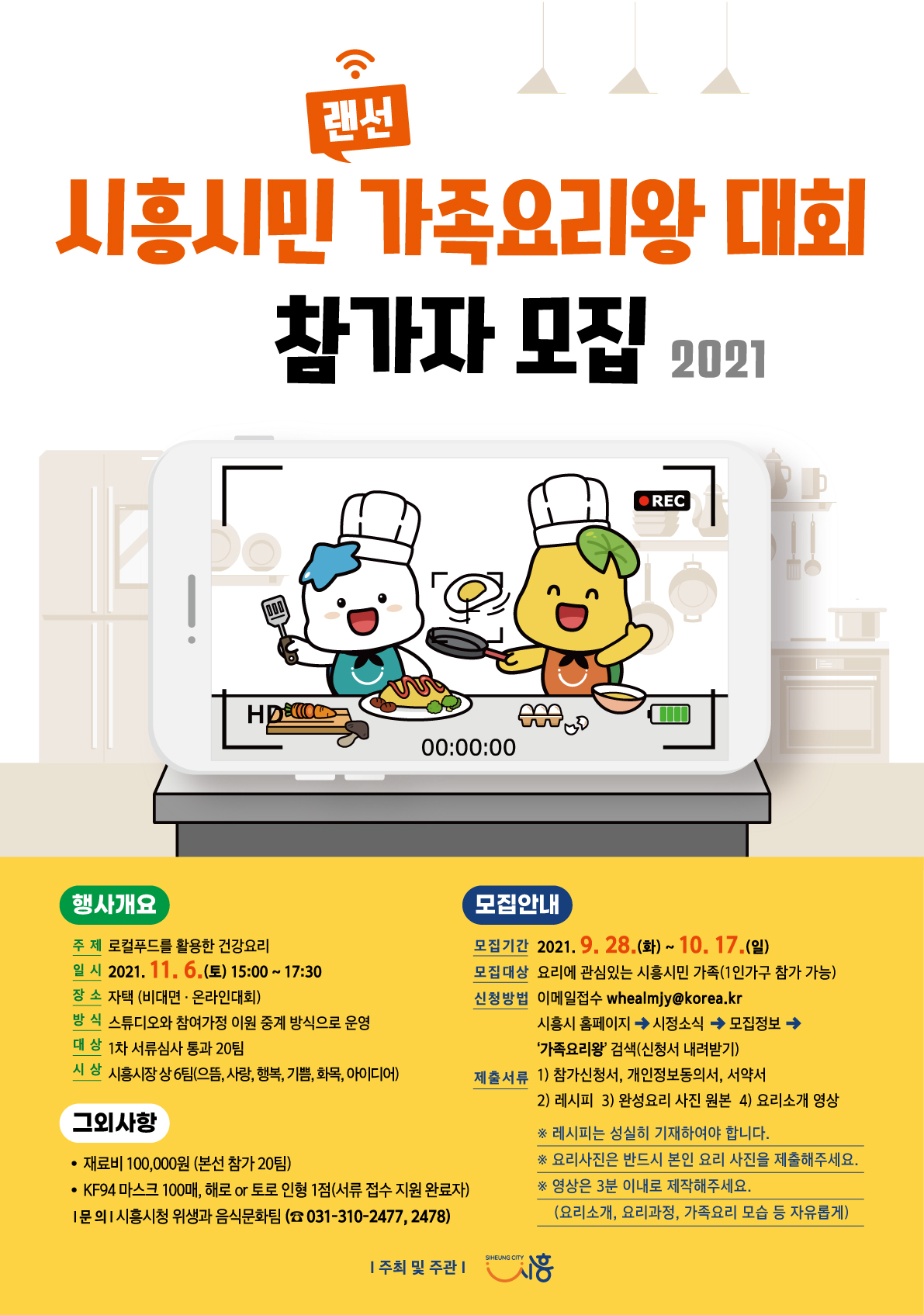 시흥시(시장 임병택)는 가족이 함께하는 요리 경연행사인 ‘2021 시흥시민 가족요리왕 대회’를 비대면·온라인으로 진행한다.