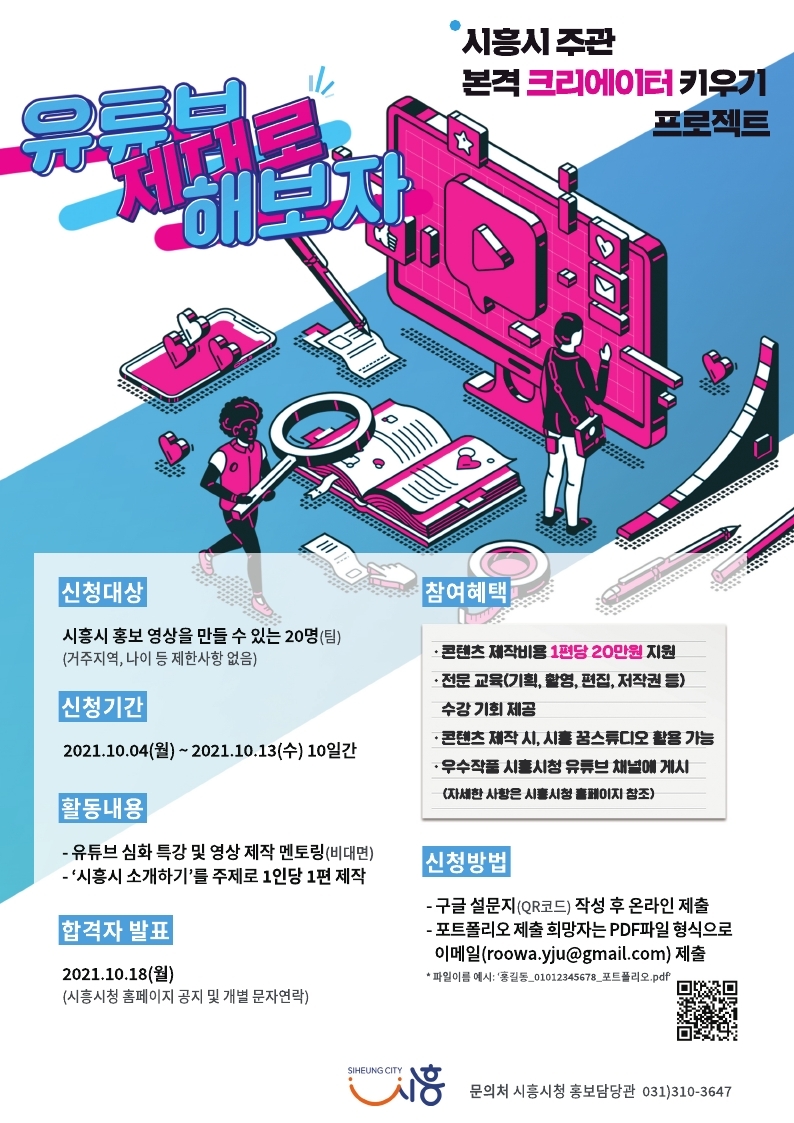 자세한 사항은 시흥시청 홈페이지(www.siheung.go.kr)를 확인하거나 홍보담당관 영상홍보팀(031-310-3647)으로 문의하면 된다.