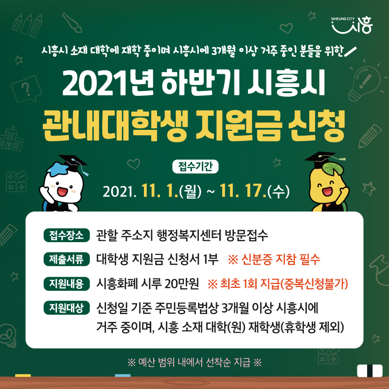 시흥시(시장 임병택)가 오는 11월 1일부터 17일까지 2021년 하반기 시흥시 관내 대학생 지원금을 각 동 행정복지센터에서 신청·접수받는다.
