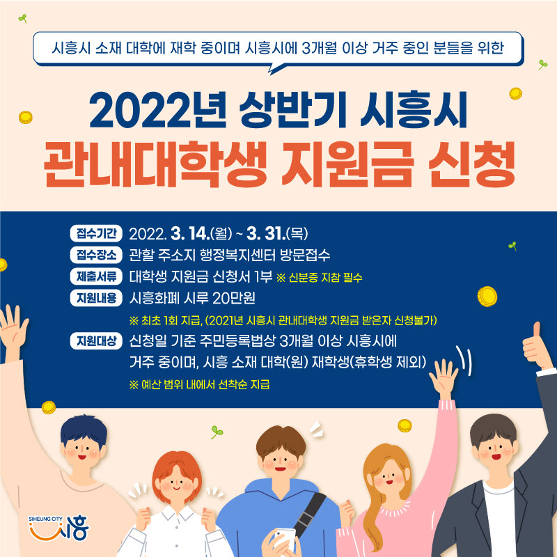 시흥시(시장 임병택)는 관내 대학생의 더 큰 성장을 도울 지원금 접수를 오는 14일부터 31일까지 동별 행정복지센터에서 신청·접수받는다.