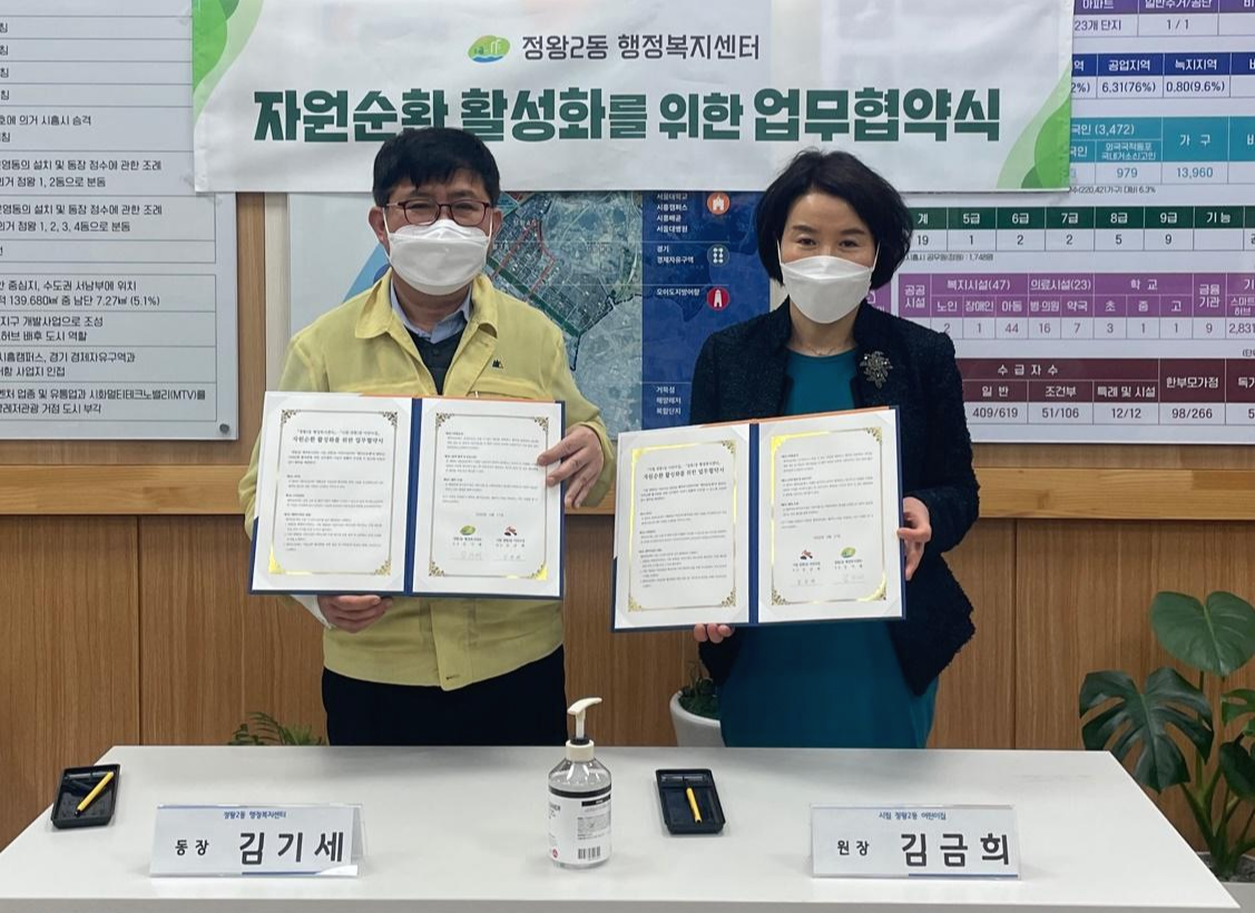 정왕2동 행정복지센터(동장 김기세)가 재활용 문화 확산을 위해 팔을 걷었다. 지난 17일 시립 정왕2동 어린이집(원장 김금희)과 올바른 재활용품 분리배출을 통해 자원순환을 활성화하고자 업무 협약을 체결해 힘을 모으기로 했다.