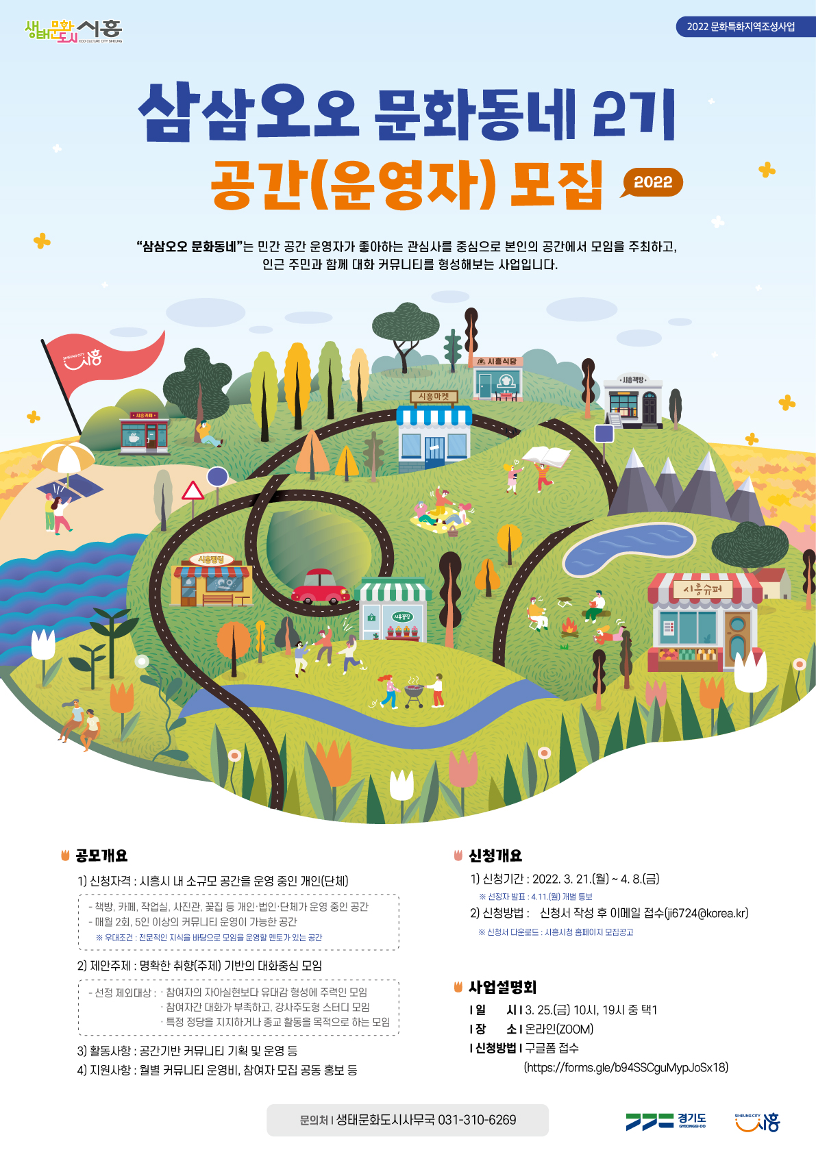 한편, 3월 25일 오전 10시, 오후 7시 총 2회에 걸쳐 온라인(Zoom) 사업설명회가 열린다. 신청은 온라인으로만 접수 가능하며, 문의는 생태문화도시사무국(031-310-6269)으로 하면 된다.