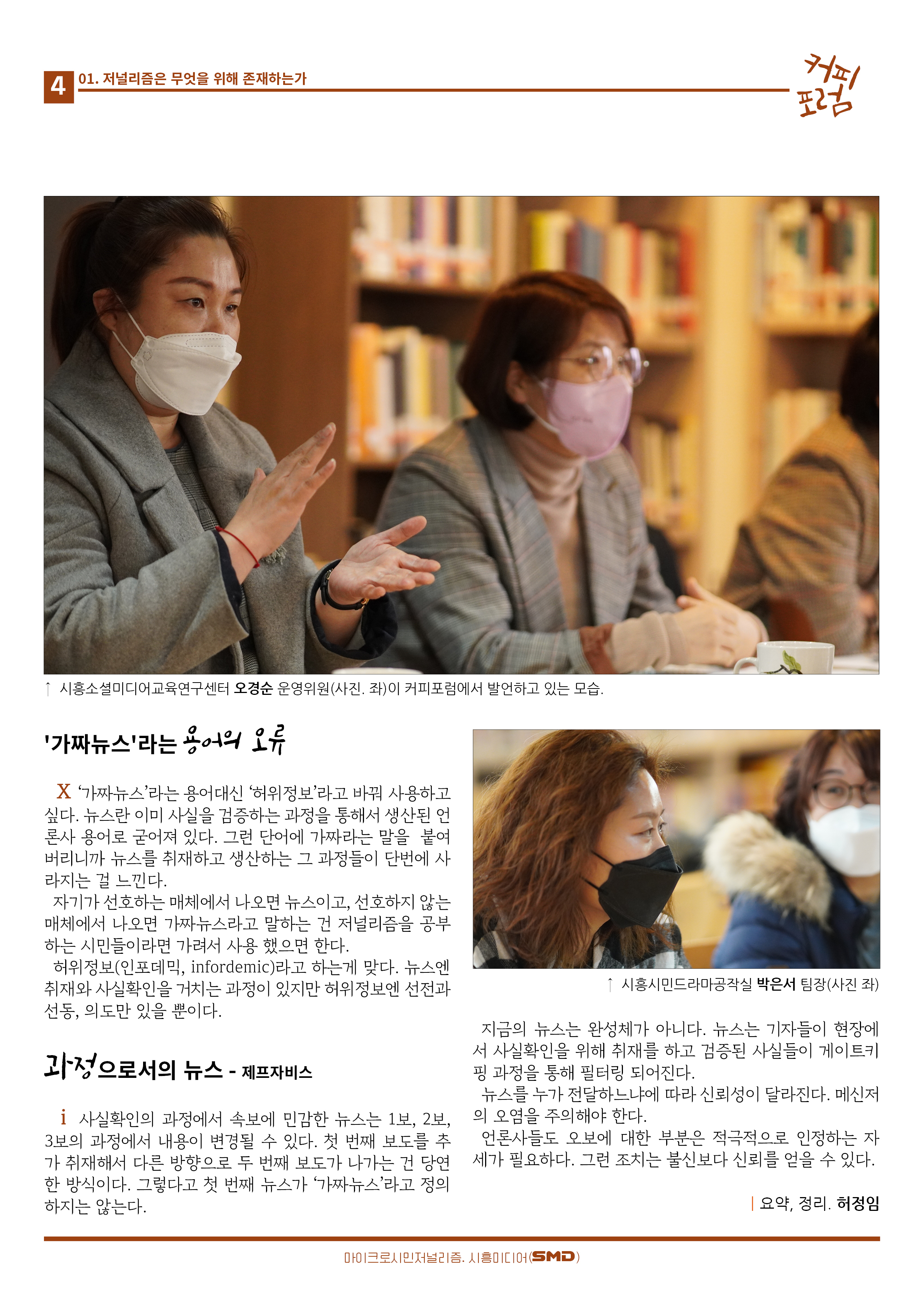 3월 12일(토) 오후 1시 30분 , 정왕본동 아시아스쿨 1층 오로시도서관에서 '저널리즘은 무엇을 위해 존재하는가?'라는 주제로 미니 [커피포럼]이 열렸다. 백재은 아시아스쿨센터장의 발제로 시작한 포럼은 박수빈, 김경순, 오경순, 곽미아, 박은서, 민회선, 허정임 등이 참여했고, 김용봉 시흥소셜미디어교육연구센터장이 진행을 맡았다.