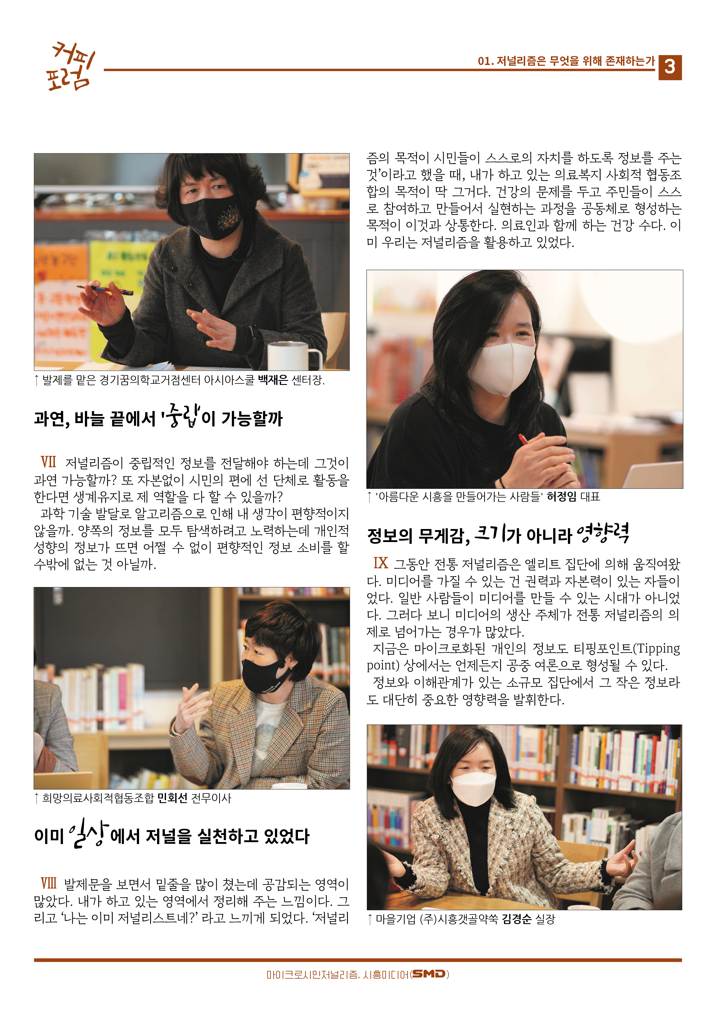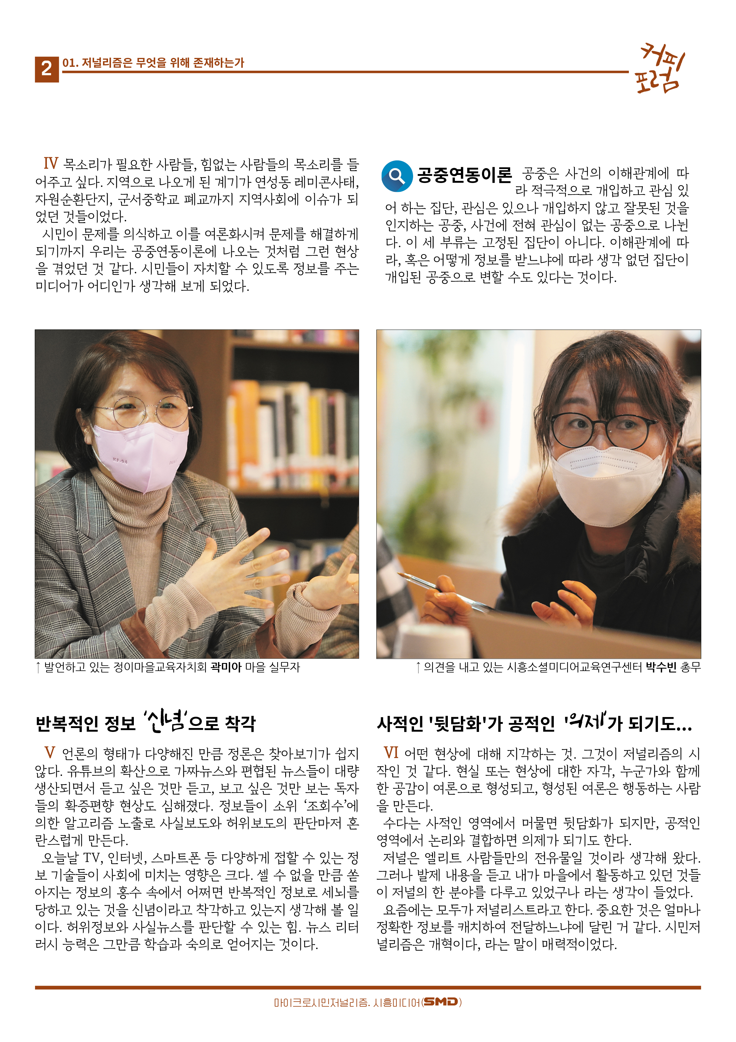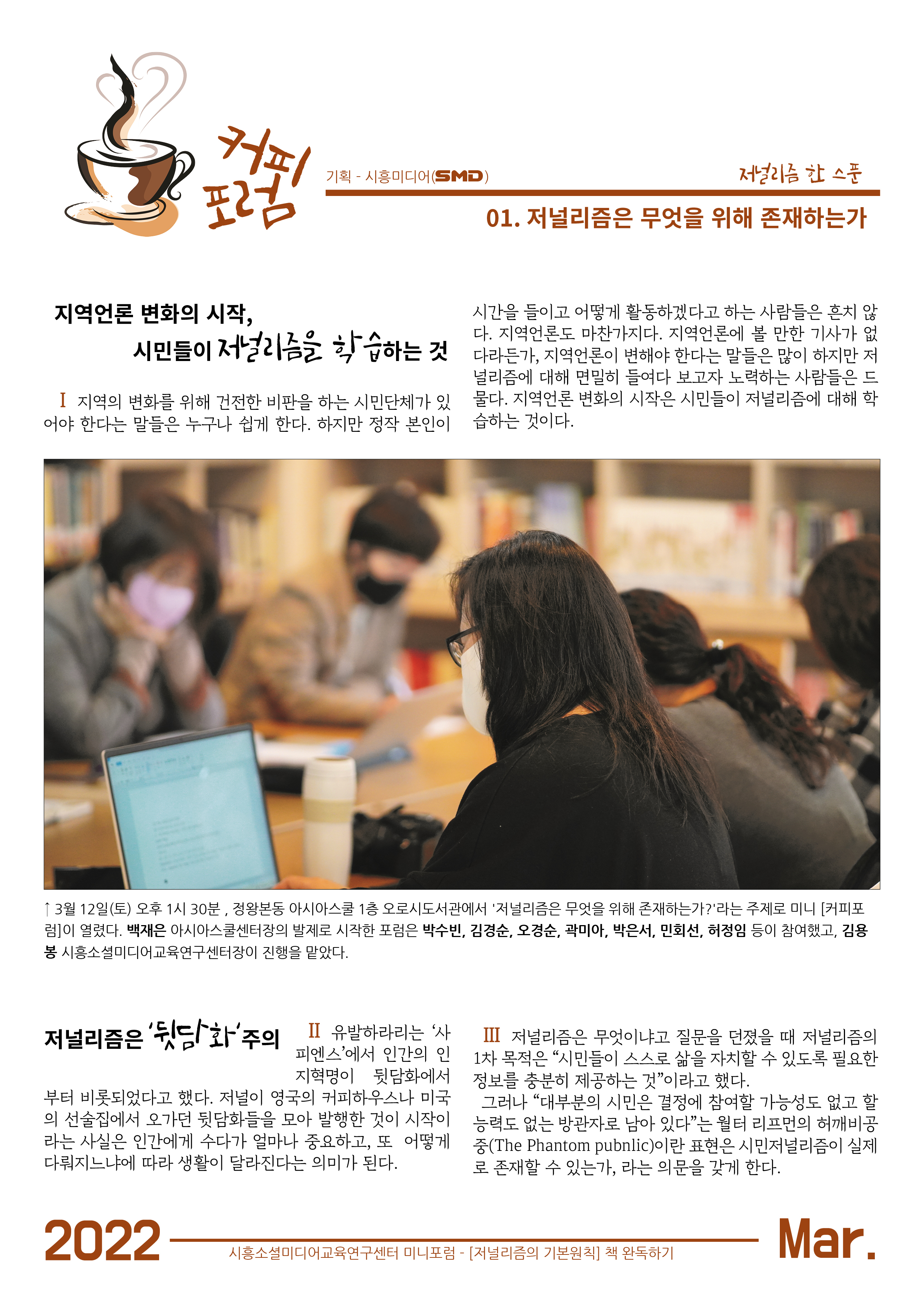 3월 12일(토) 오후 1시 30분 , 정왕본동 아시아스쿨 1층 오로시도서관에서 '저널리즘은 무엇을 위해 존재하는가?'라는 주제로 미니 [커피포럼]이 열렸다. 백재은 아시아스쿨센터장의 발제로 시작한 포럼은 박수빈, 김경순, 오경순, 곽미아, 박은서, 민회선, 허정임 등이 참여했고, 김용봉 시흥소셜미디어교육연구센터장이 진행을 맡았다.