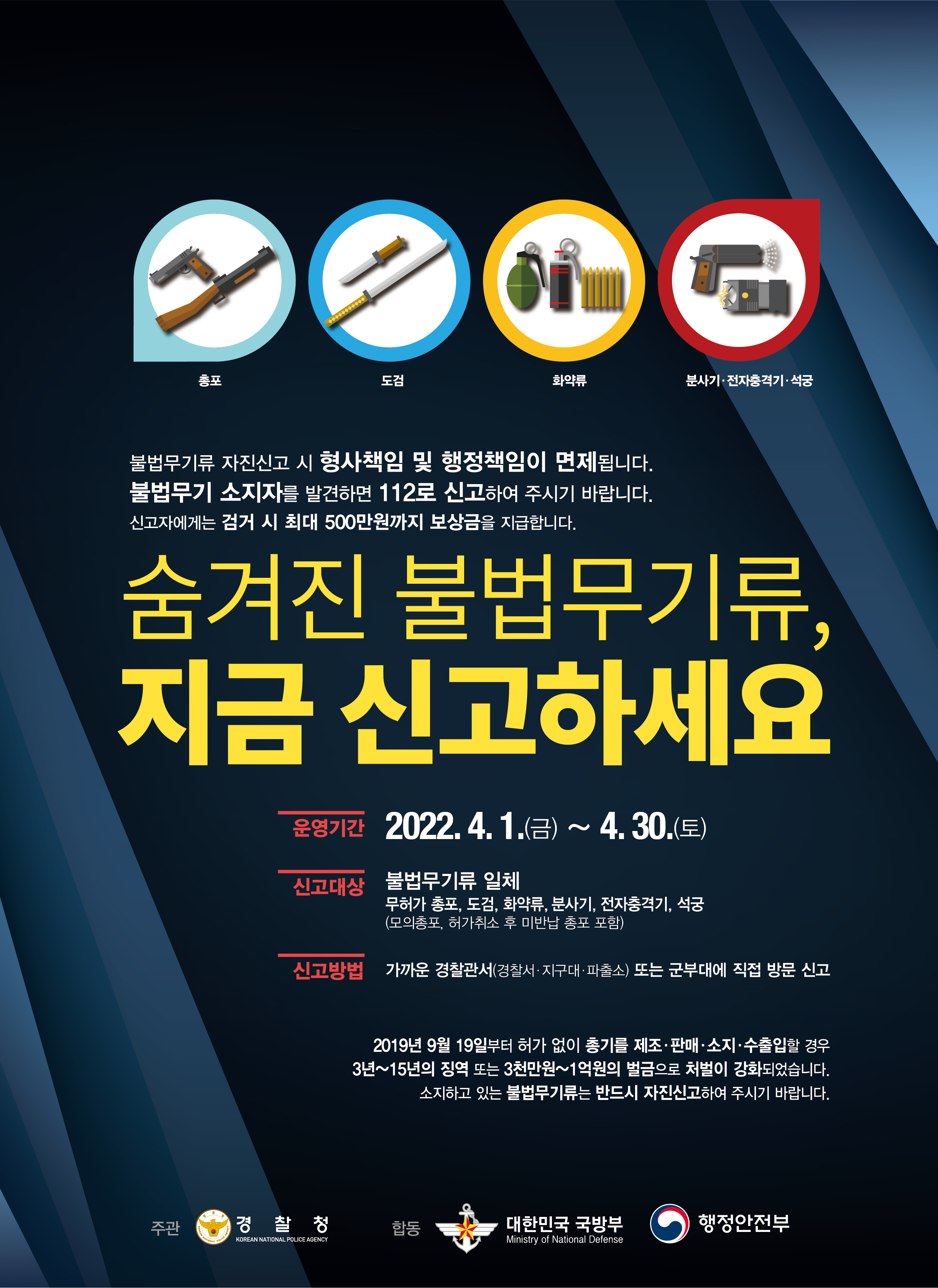 자진신고기간 종료 후 5월 한 달간 불법무기 집중 단속을 할 계획으로, 이번 자진신고기간에 불법무기를 모두 신고할 것을 당부했다.