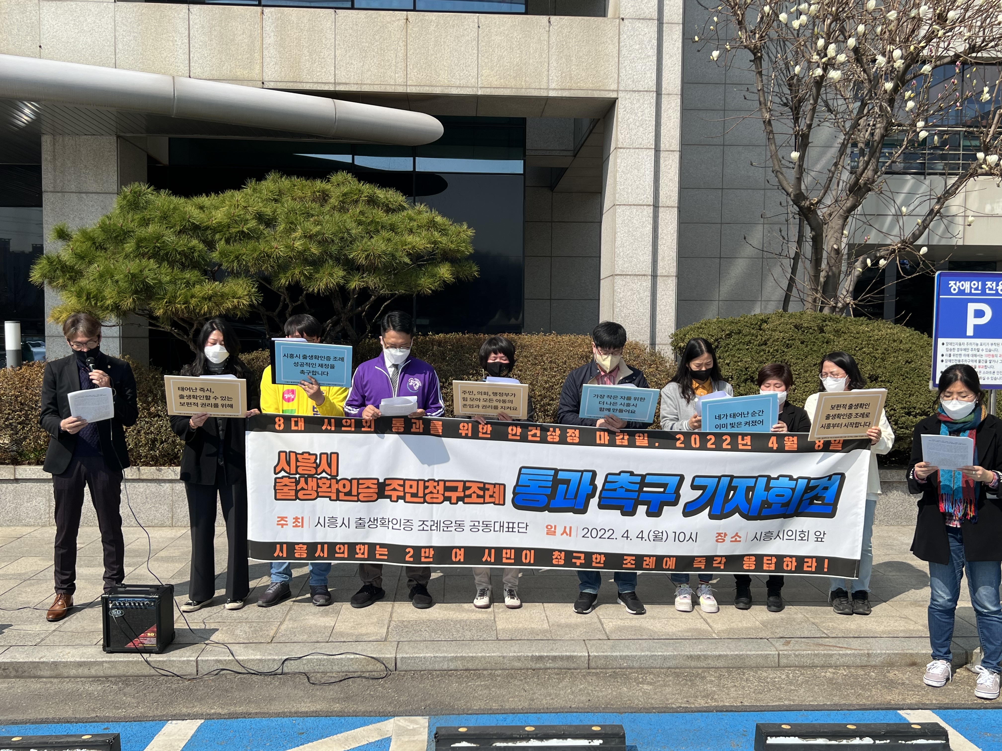 지난해 11월에 시민 22,000여명이 서명하고 제정을 지지한 ‘시흥시 출생확인증 작성 및 발급에 관한 조례’가 상위법과 충돌한다는 이유로 시의회에 머물러 있자 조례제정 청구 공동대표단과 운영단이 4일 오전 10시, 시흥시의회 앞에서 조례 통과촉구 기자회견을 열었다.