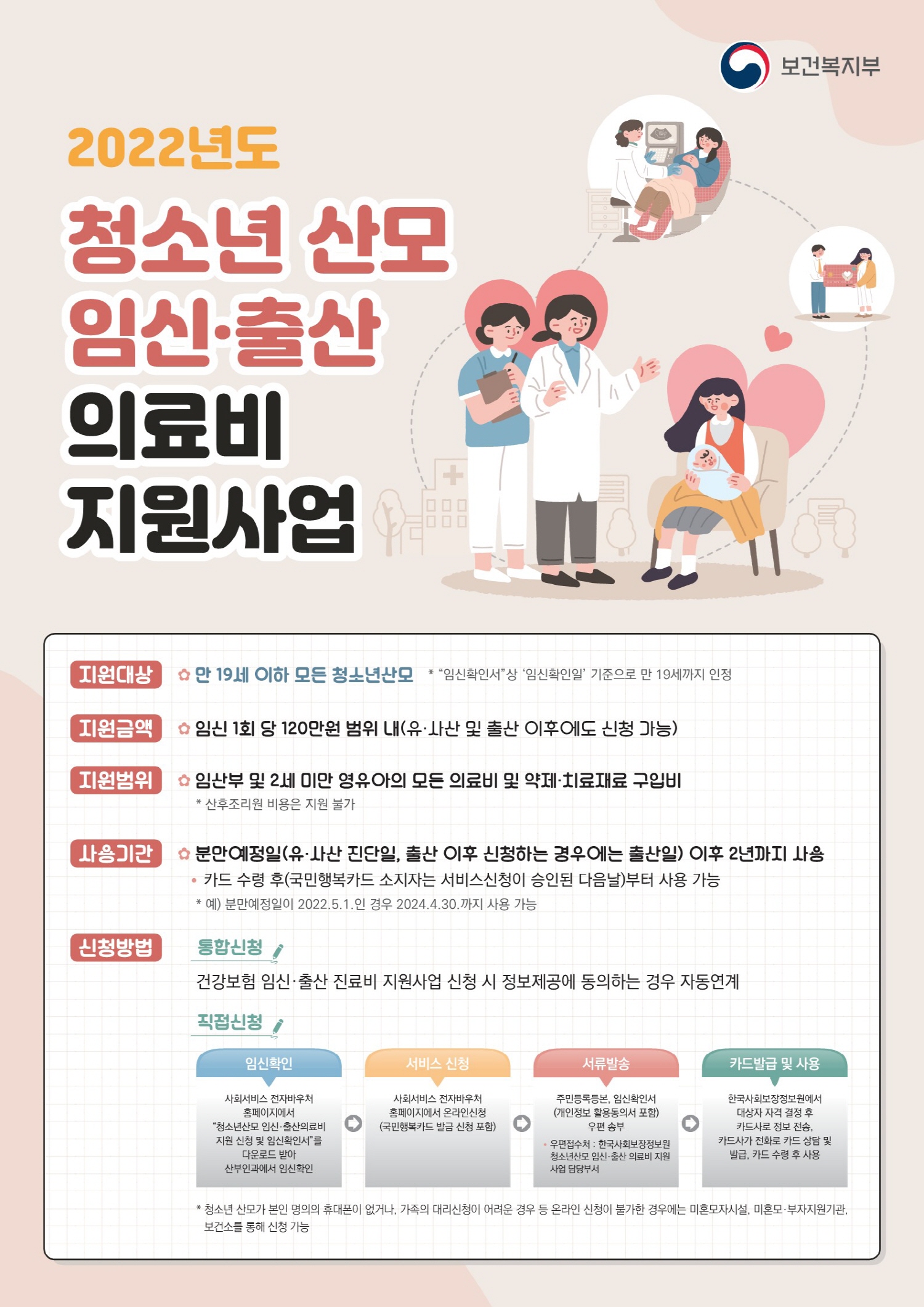 지원 범위는 임산부 및 2세 미만 영유아의 모든 의료비 및 약제‧치료재료 구입비며, 임신 1회당 120만 원 내에서 지원한다.