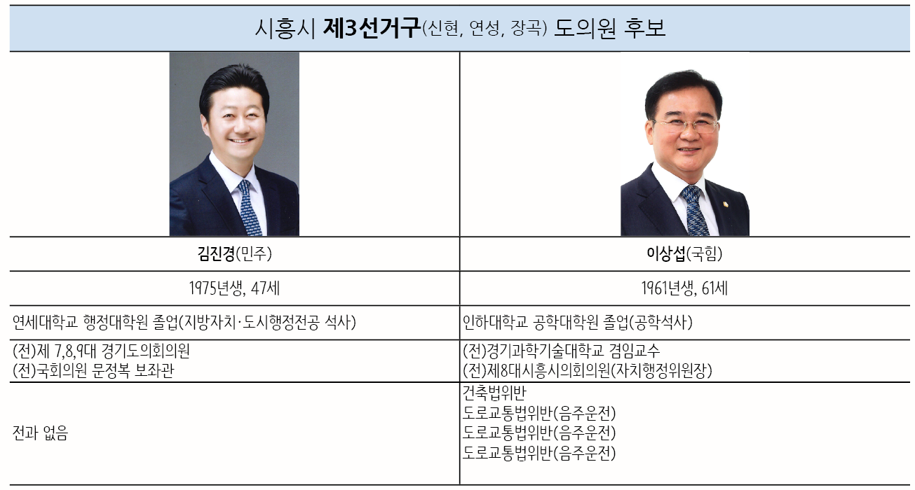 제5선거구(정왕3동, 정왕4동, 배곧1동, 배곧2동)는 이동현 현 도의원과 김만식 국민의힘 시흥을 당협 부위원장이 출전했다.