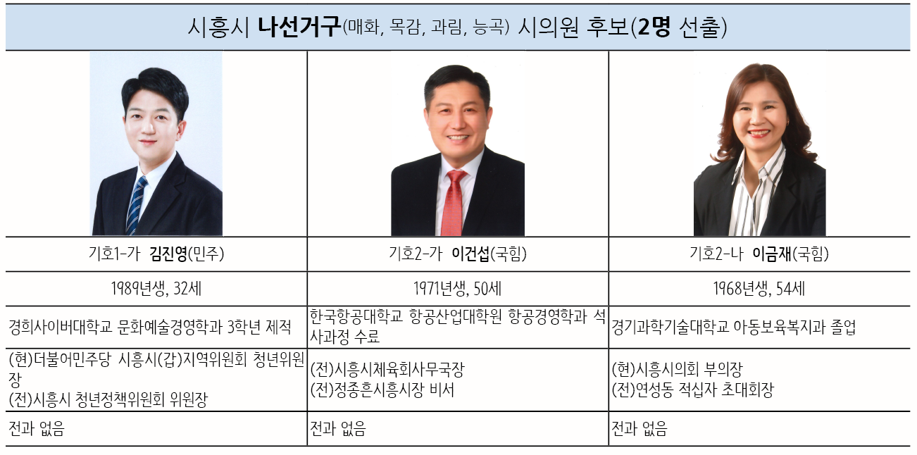 2명을 선출하는 나선거구(매화동, 목감동, 과림동, 능곡동)에서는 3명의 후보가 나왔다. 더불어민주당 기호1-가, 김진영(32) 현 더불어민주당 시흥시(갑)지역위원회 청년위원장이 출마했고, 국민의힘에서는 기호2-가, 이건섭(50) 전 시흥시체육회사무국장과 기호 2-나, 이금재(54) 현 시흥시의회 의원이 나섰다.