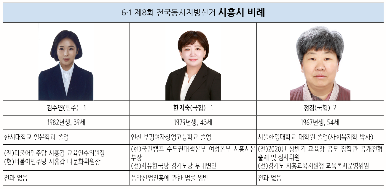 비례대표는 더불어민주당 시흥시(갑) 다문화위원장인 김수연(39) 후보가 공천을 받았고, 국민의힘은 한지숙(43) 현)국민캠프 수도권대책본부 여성본부 시흥시본부장이 1번을, 정경(54)지역아동센터장이 2번을 받았다.