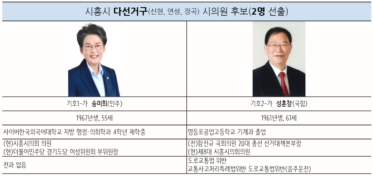 2명의 의원을 선출하는 다선거구(신현동, 연성동, 장곡동)는 2명의 후보만 나와서 무투표 당선가능성이 예상되는 지역이다. 더불어민주당 기호1-가, 송미희(55) 현 시흥시의회 의원과 기호2-가, 국민의힘 성훈창(61) 현 시흥시의회 의원이다.