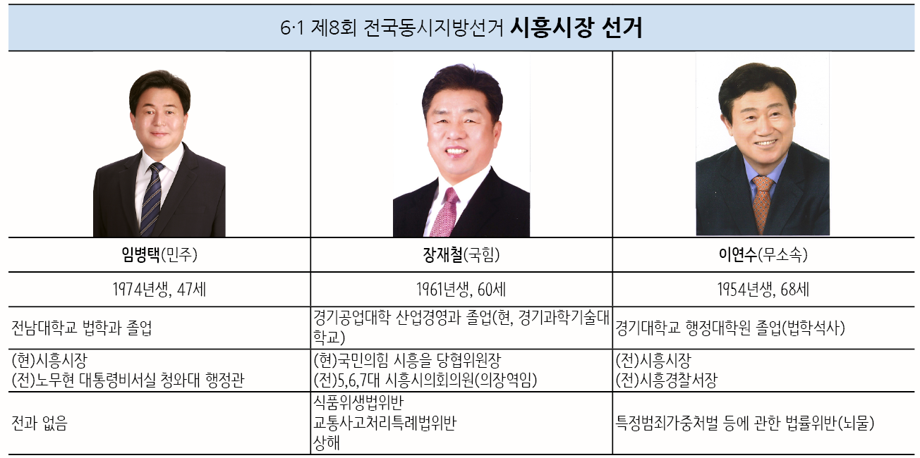 먼저, 시흥시장 후보로는 더불어민주당 임병택 현 시흥시장이 재선을 노린다. 이에 맞서 국민의힘에서는 장재철 국민의힘 시흥을 당원협의회 위원장이 도전장을 내밀었다. 여기에 국민의힘 공천에서 컷오프된 이연수 전 시흥시장이 무소속 출마를 선언하고 나서면서 시흥시장 선거는 3파전으로 치러질 가능성이 있다.