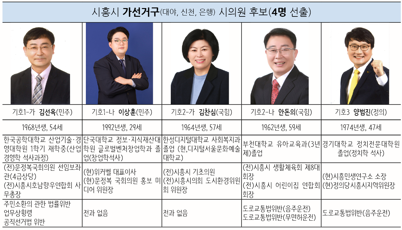 4명을 선출하는 가선거구(대야동, 신천동, 은행동)에서는 5명의 후보가 나왔다. 더불어민주당 기호1-가, 김선옥(54) 현 문정복 국회의원 선임보좌관과 기호1-나 이상훈(29) 현 문정복 국회의원 홍보미디어위원장이 나섰고, 국민의힘에서는 기호2-가, 김찬심(57) 前 시흥시의회 의원과 기호2-나, 안돈의(59) 현 시흥시의회 의원이 출전했다. 정의당에서는 기호3, 양범진(47) 현 정의당시흥시지역위원장이 나섰다. 이 지역구는 4명이 당선되는 곳인 만큼 민주-국힘 양당 나번을 받은 후보와 정의당 후보 간의 격돌이 예상된다.