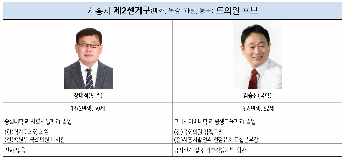 제2선거구(매화동, 목감동, 과림동, 능곡동)는 장대석 현 도의원과 김승식 전 함진규 국회의원 정책국장이, 제3선거구(신현동, 연성동, 장곡동)는 김진경 전 경기도의회 3선의원과 이상섭 현 시흥시의회 자치행정위원장이 출전한다.