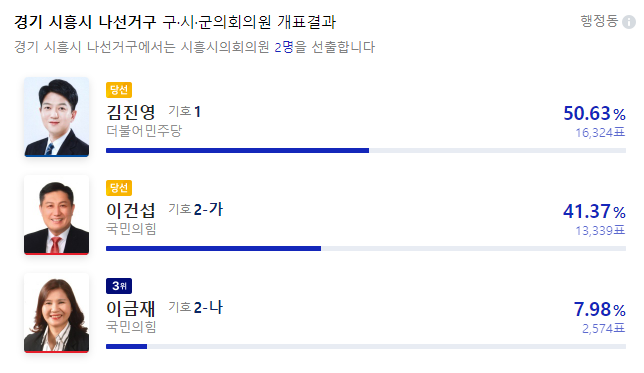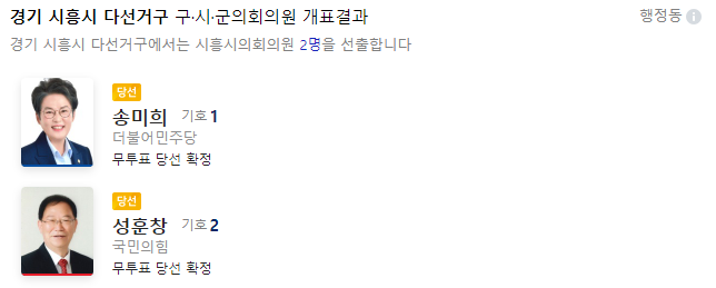 무투표 당선이 확정된 다선거구(신현동, 연성동, 장곡동)는 더불어민주당 기호1-가, 송미희(55) 현 시흥시의회 의원과 기호2-가, 국민의힘 성훈창(61) 현 시흥시의회 의원이 나란히 의회에 합류했다.