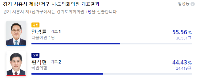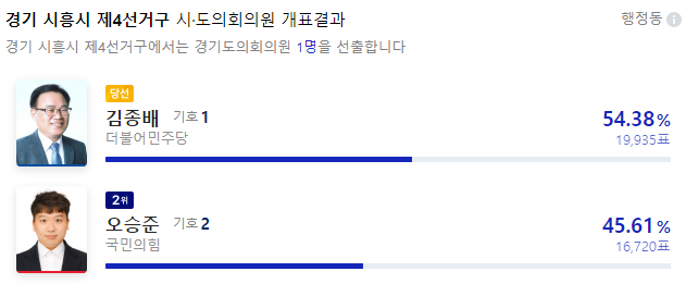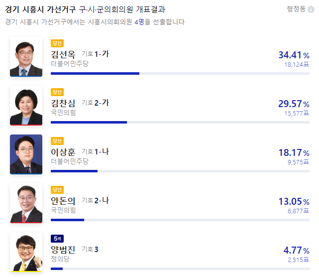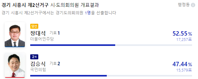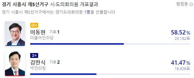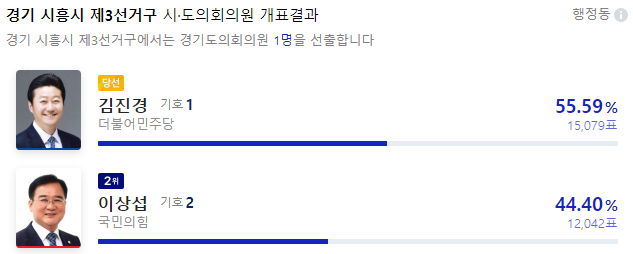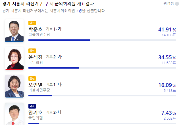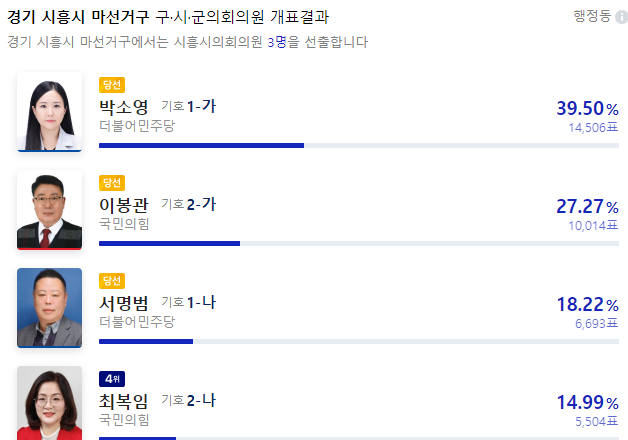 무투표 당선이 확정된 다선거구(신현동, 연성동, 장곡동)는 더불어민주당 기호1-가, 송미희(55) 현 시흥시의회 의원과 기호2-가, 국민의힘 성훈창(61) 현 시흥시의회 의원이 나란히 의회에 합류했다.
