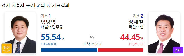 더불어민주당 임병택 후보는 국민의힘 장재철 후보를 21,251표차로 누르며 재선에 성공했다.
