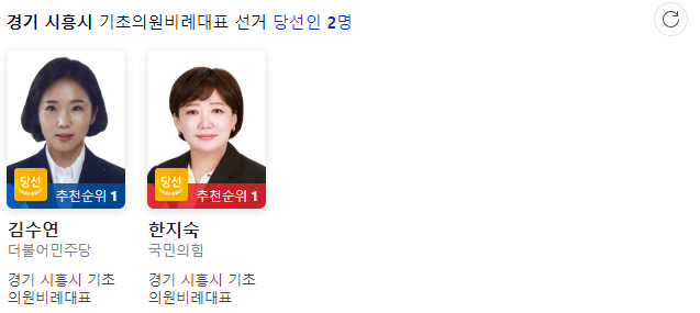비례대표 당선자는 더불어민주당 시흥시(갑) 다문화위원장인 김수연(39) 후보와 국민의힘 한지숙(43) 현)국민캠프 수도권대책본부 여성본부 시흥시본부장이 확정됐다.