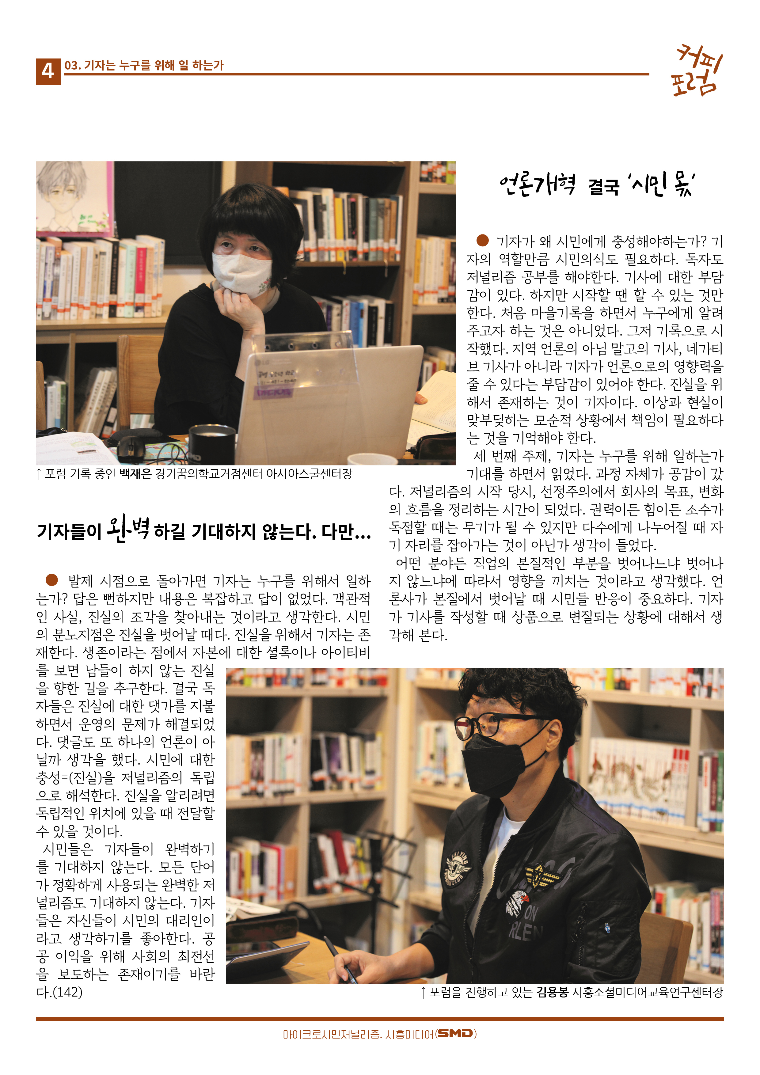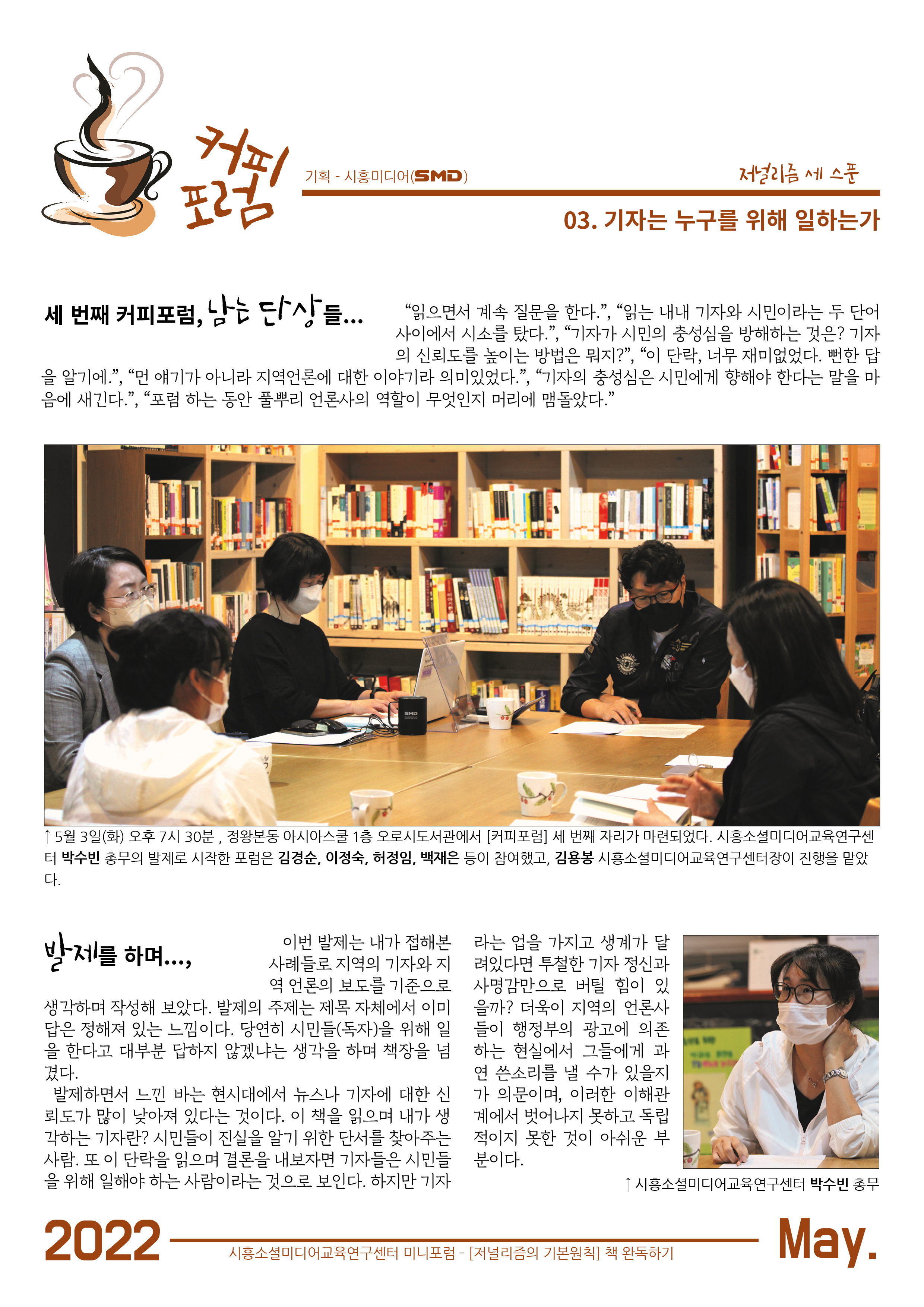 지난 5월 3일(화) 오후 7시 30분 , 정왕본동 아시아스쿨 1층 오로시도서관에서 '기자는 누구를 위해 일하는가?'라는 주제로 미니 [커피포럼] 3회가 열렸다. 박수빈 시흥소셜미디어교육연구센터 총무의 발제로 시작한 포럼은 백재은, 허정임, 이정숙, 김경순 등이 참여했고, 김용봉 시흥소셜미디어교육연구센터장이 진행을 맡았다.
