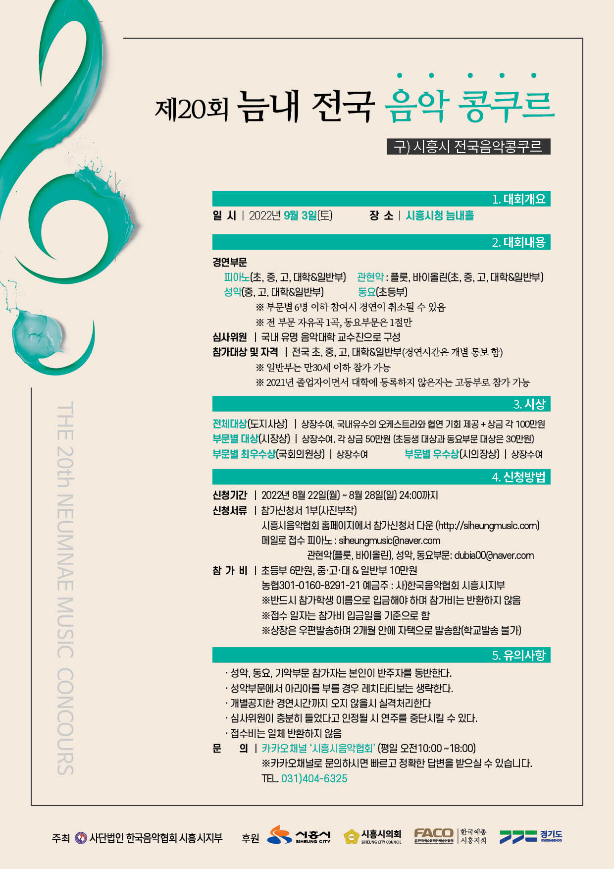 시흥시 음악협회가 제20회 늠내 전국 음악 콩쿠르((구) 시흥시 전국음악콩쿠르)를 오는 9월 3일 시흥시청 늠내홀에서 개최한다.