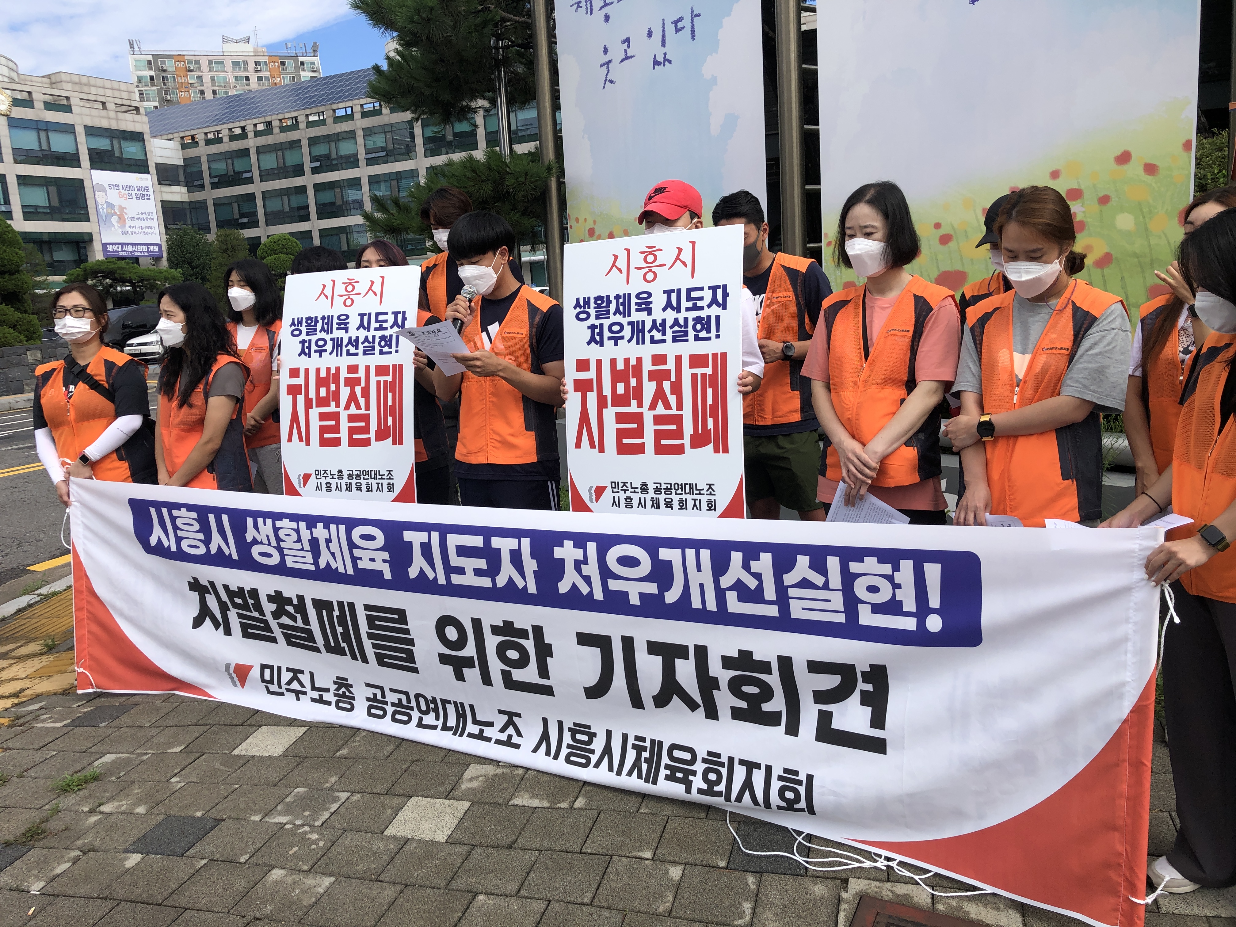 민주노총 공공연대노조 시흥시생활체육회는 8월 10일(수) 오전 9시 30분 시흥시청 정문 앞에서 집회를 열고 다음과 같은 요구를 했다.