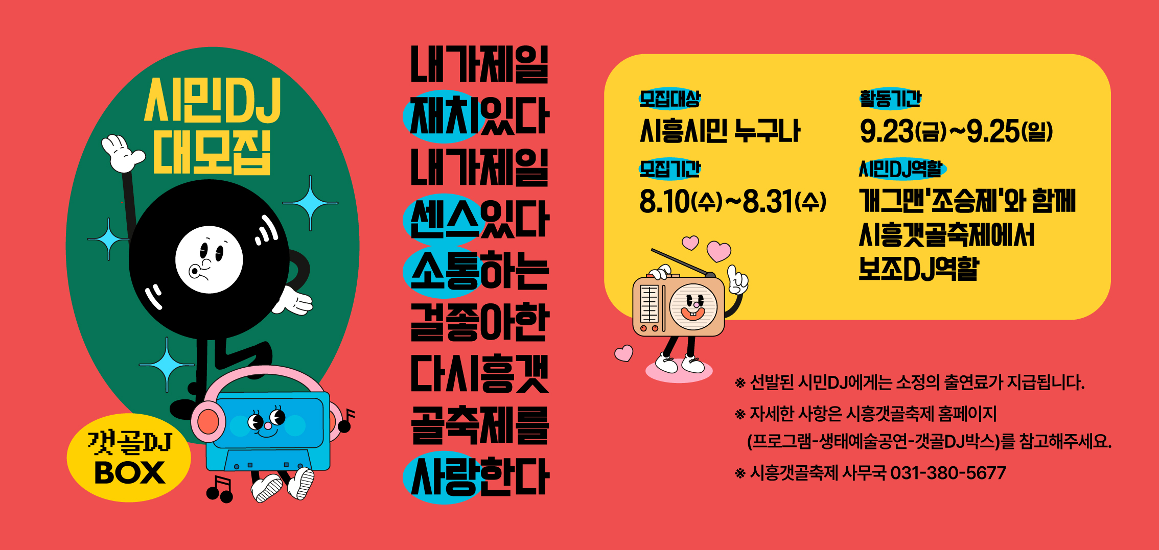 시흥시(시장 임병택)가 오는 9월 23일부터 25일에 열리는 시흥갯골축제의 ‘갯골DJ박스’에서 갯골DJ와 함께할 시민DJ 참여자를 모집한다.