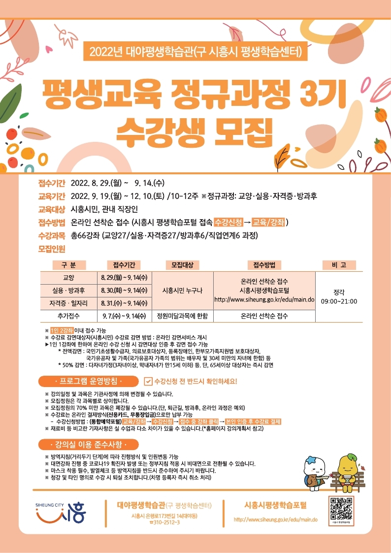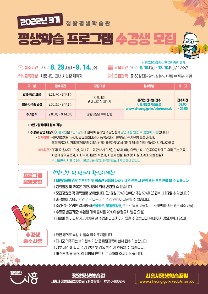 시흥시(시장 임병택)가 오는 29일부터 9월 14일까지 2022년 3기 평생학습 프로그램 수강생을 모집한다.