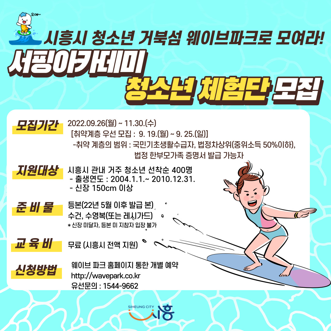 체험단 신청 대상은 2004년 1월 1일 이후에서 2010년 12월 31일 이전에 출생한 시흥시 거주 청소년으로, 신장 150cm 이상이면 누구나 서핑 체험단이 될 수 있다.