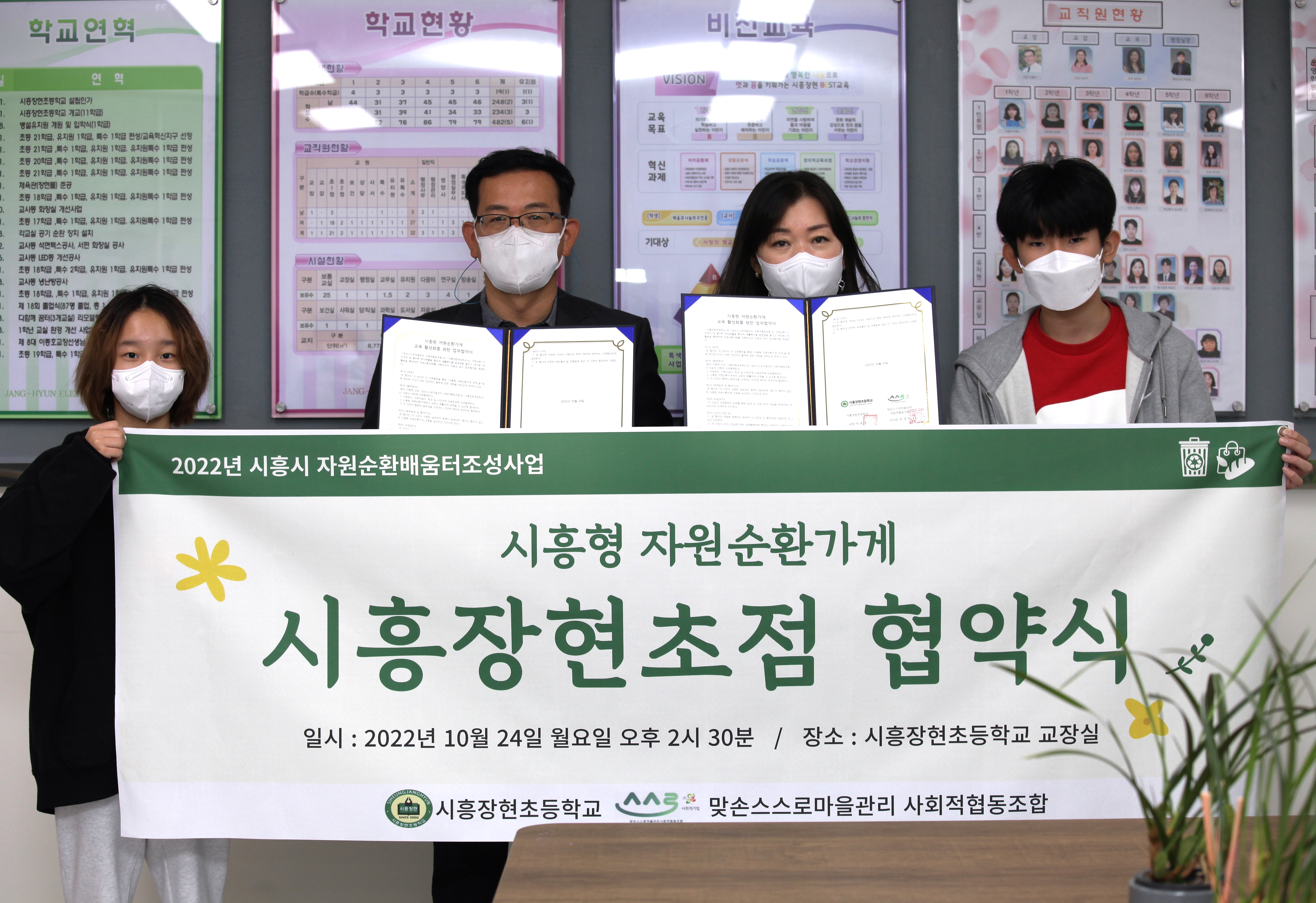 장현초와 맞손은 자원순환 인식개선 및 올바른 분리배출을 통해 생활폐기물 발생량을 줄이고, 재사용 및 재활용을 확대하여 자원순환사회 구현을 위한 시흥형 자원순환가게 운영 업무협약을 체결했다. 주요 내용으로는 ▲자원회수, 자원나눔터, 학교 및 시민연계 교육 운영 ▲시흥형 자원순환가게의 원활한 교육 ▲각 기관 협력의 필요성을 인정하는 사안에 대한 유연함 등이다.