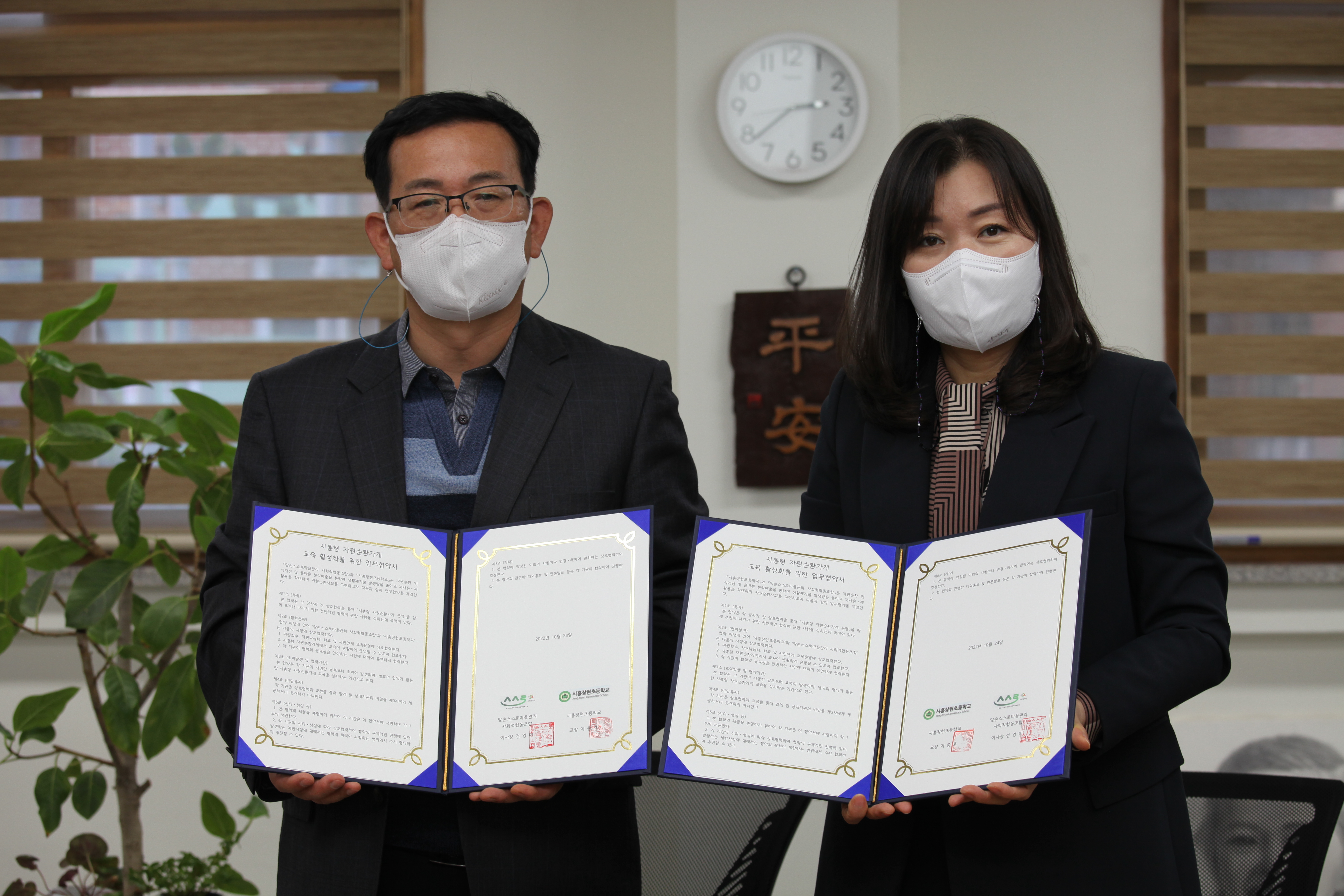 지난 24일, 맞손스스로마을관리사회적협동조합(이사장 정영미, 이하 맞손)은 시흥장현초등학교(교장 이종호, 이하 장현초)는 장현초 교장실에서 「찾아가는 자원순환가게」협약식을 맺었다.