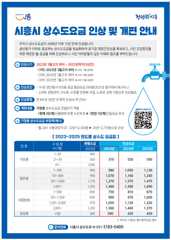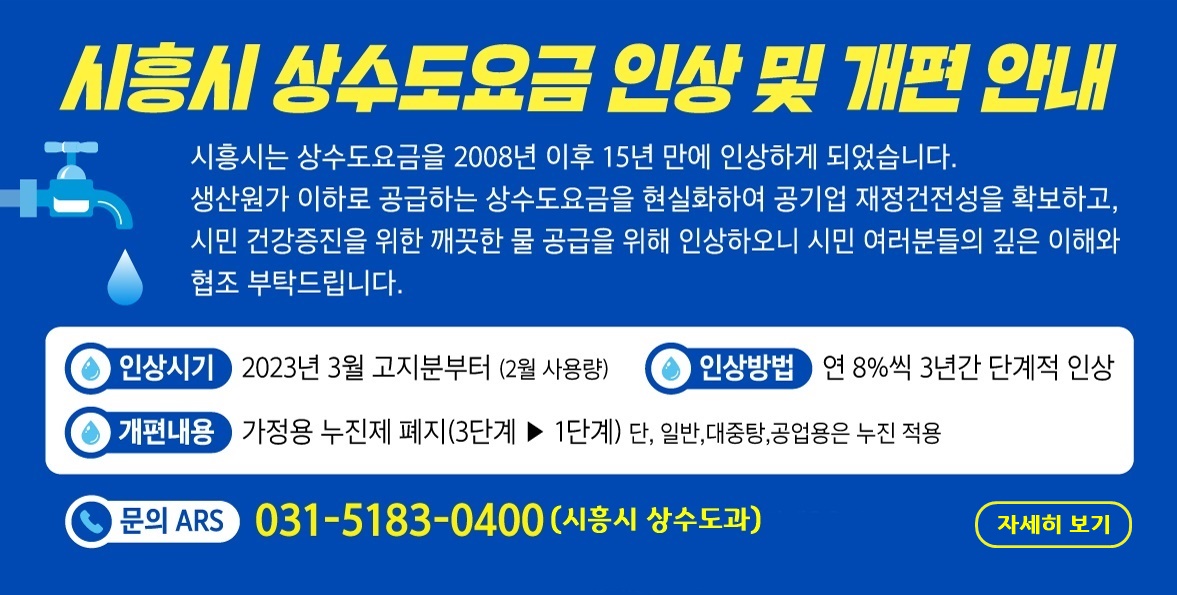 기타 자세한 사항은 시흥시 상수도과 누리집(https://water.siheung.go.kr) 또는 시흥시 청 상수도과 수도요금팀(ARS 031-5183-0400)으로 문의하면 된다.