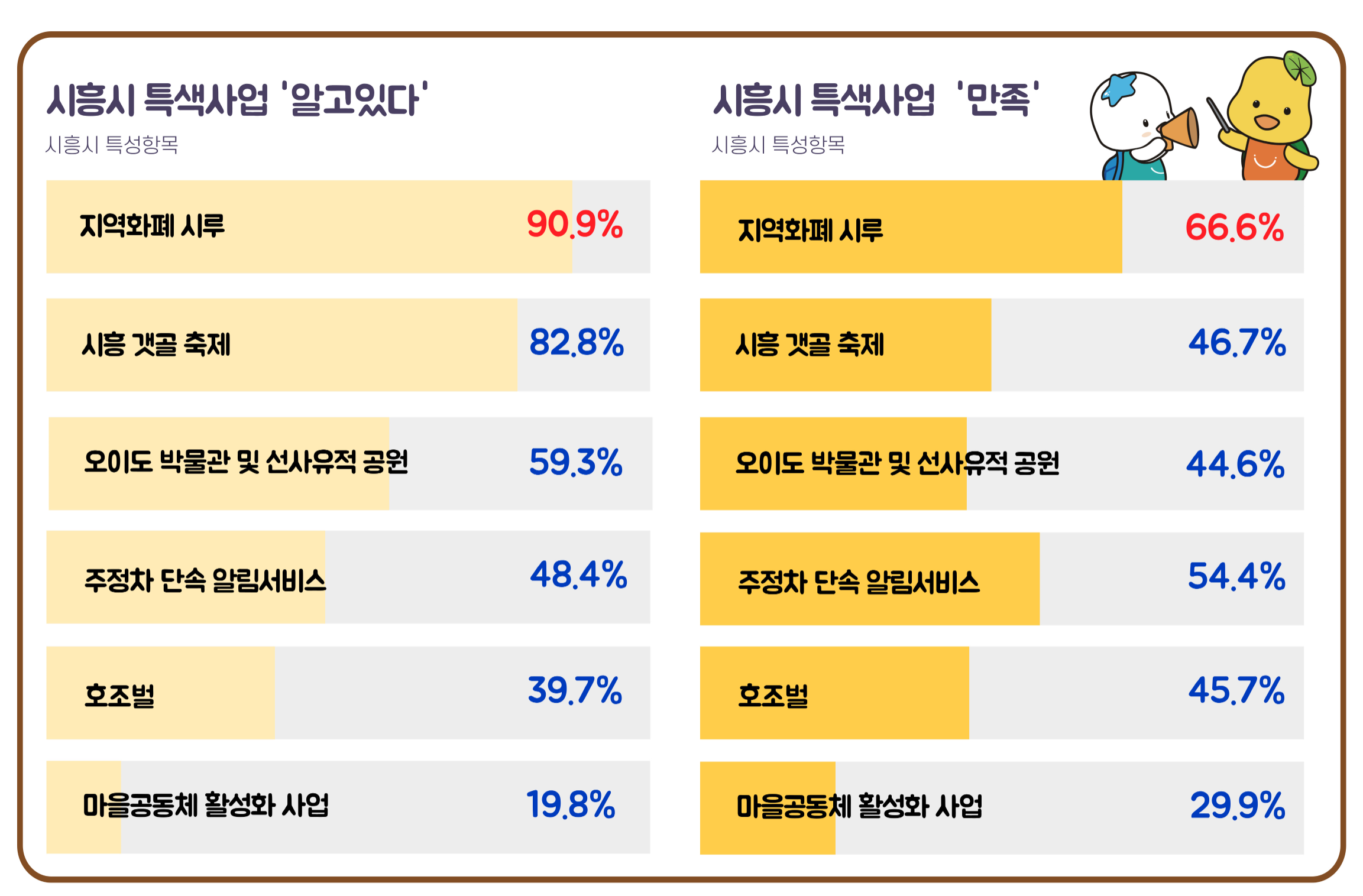 시흥시 특성항목 조사 결과에서는 지역화폐 시루, 시흥갯골축제, 오이도박물관, 호조벌 등 시흥시가 추진하는 특색사업 인지도가 2021년 대비 모두 상승한 점이 눈에 띄었다.