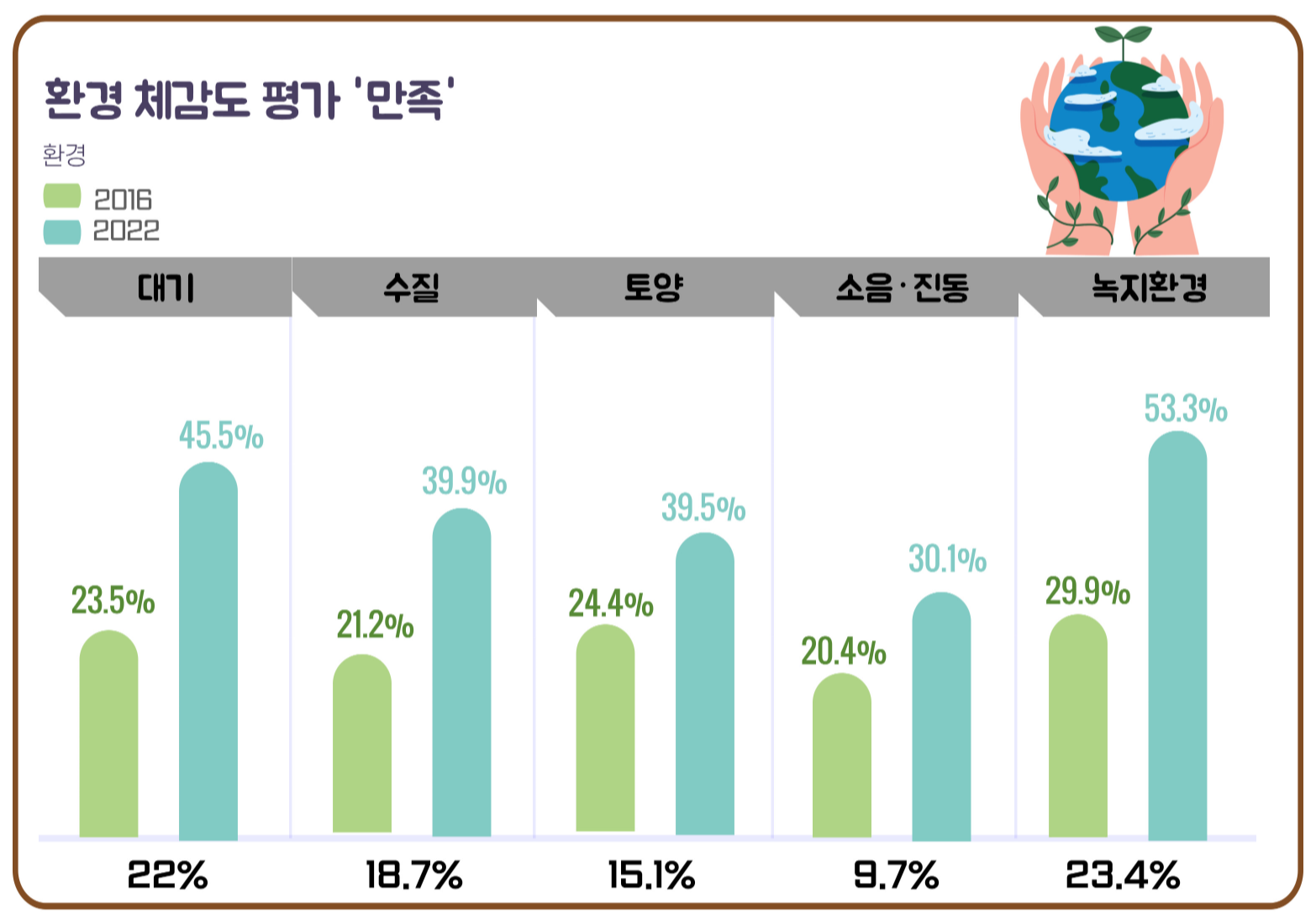 그 결과, 2016년 대비 대기(45.5%), 수질(39.9%), 토양(39.5%), 소음·진동(30.1%), 녹지환경(53.3%) 전 분야에서 만족도가 월등히 높아지는 놀라운 성과를 얻었다.