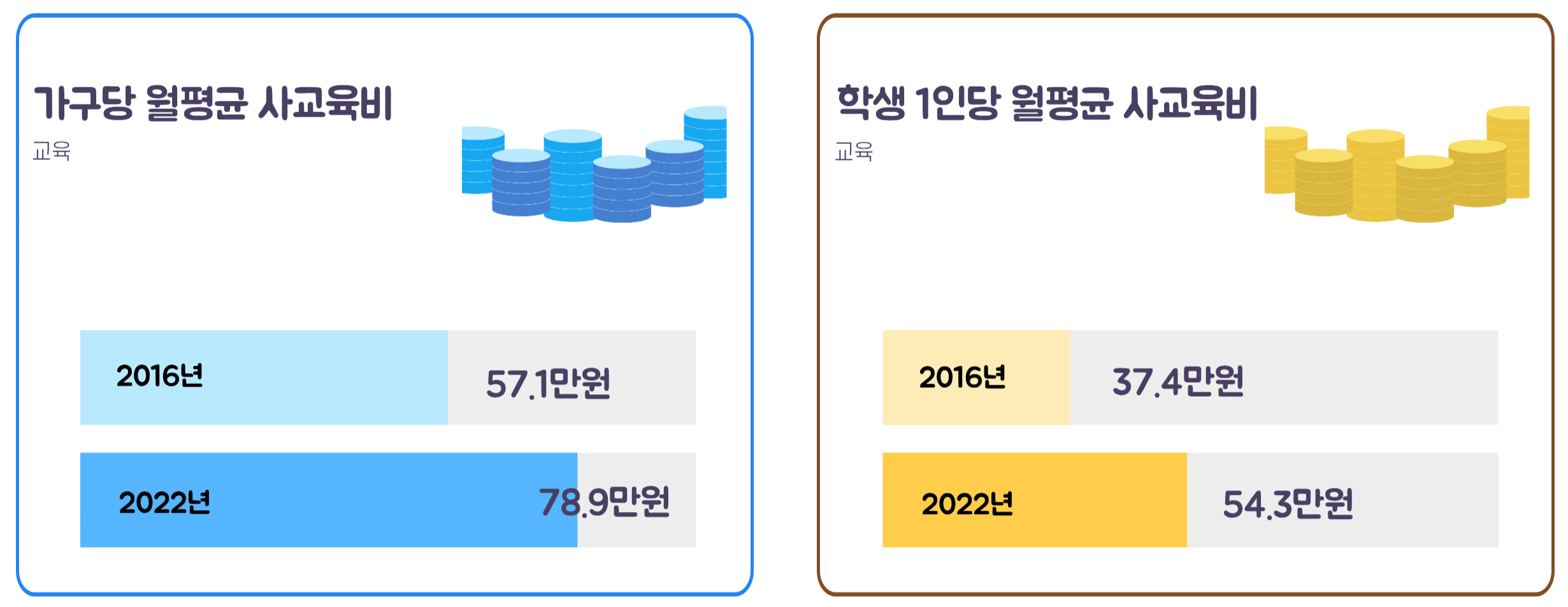 코로나19 시대를 겪으며 많은 우려를 낳았던 공교육 분야에서는 학교교육(지식·기술습득, 인격 형성, 국가관 및 사회관 정립, 생활·직업·취업에 활용) 효과에 대해 긍정적인 답변율이 올라갔음에도 가구당 월평균 사교육비는 57만1천원에서 78만9천원(38% 증가)으로, 학생 1인당 월평균 사교육비는 37만4천원에서 54만3천원(45% 증가)으로 늘어났다.