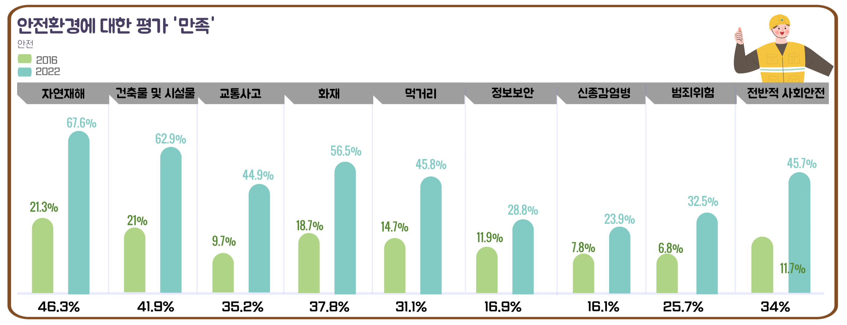 특히 2016년 대비 자연재해, 건축물 및 시설물, 교통사고, 화재, 먹거리, 정보보안, 신종감염병, 범죄 위험과 전반적인 사회안전 분야의 모든 지표에서 3배 가까이 만족도가 상승해 환경 분야와 더불어, 시민들의 인식 개선에 괄목할 만한 성과를 보였다.