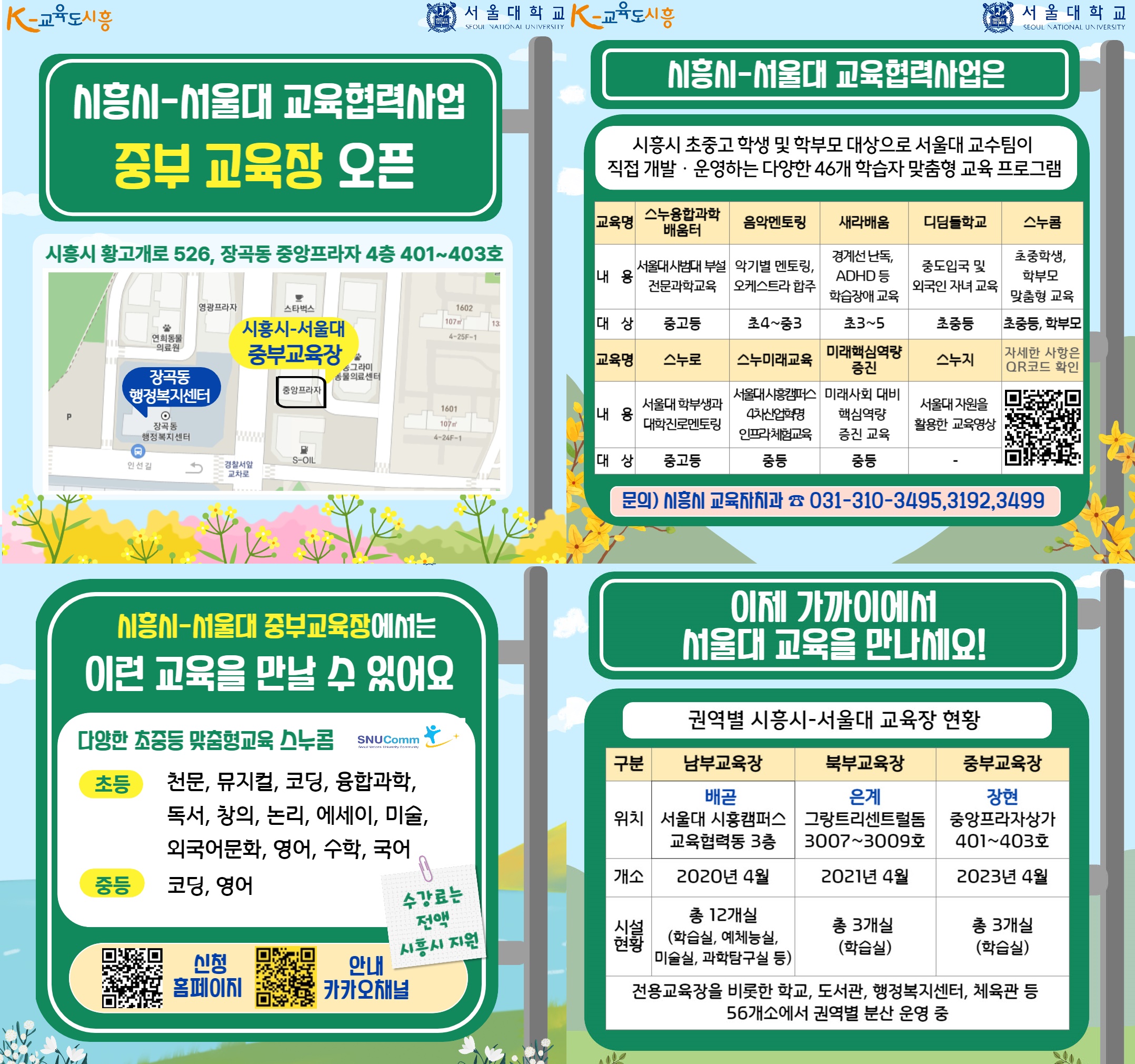 서울대 교육협력사업 중부교육장 운영에 관한 자세한 사항은 시흥시 평생교육원 교육자치과(031-310-3495)로 문의하면 된다.