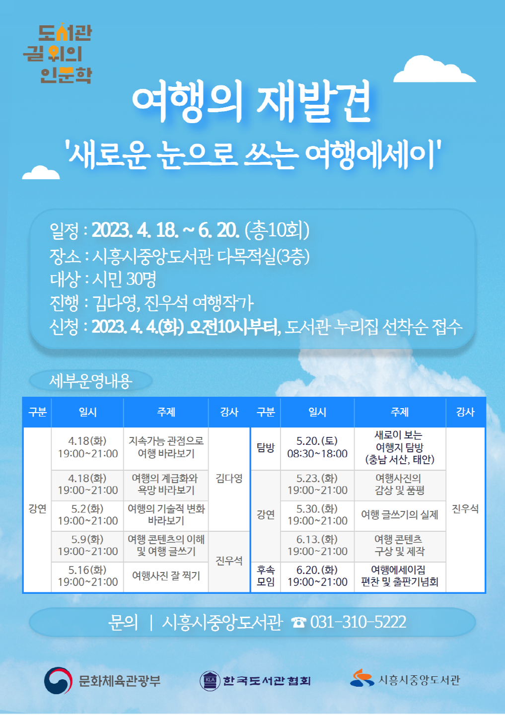 시흥시중앙도서관 다목적실에서 진행되는 ‘여행의 재발견’ 프로그램은 시민 30명을 대상으로 김다영, 진우석 여행 작가가 진행한다. 신청은 4월 4일 오전 10시부터 시흥시도서관 누리집에서 선착순으로 접수를 받는다.