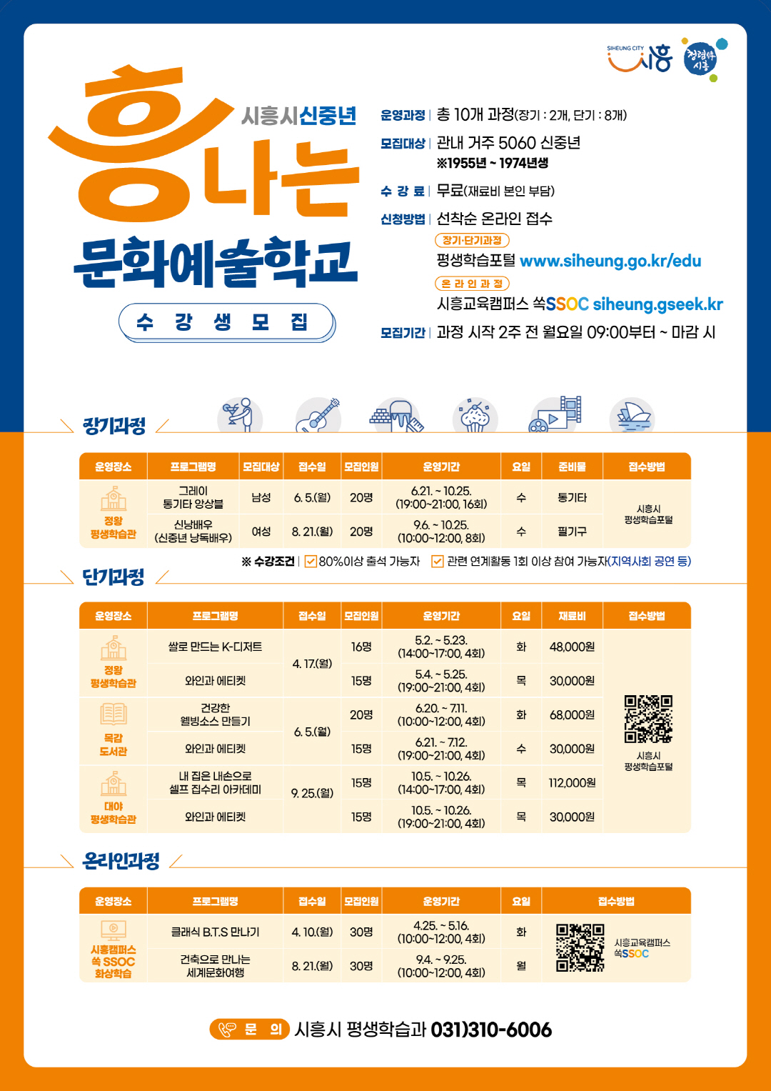 각 강좌에 대한 자세한 교육 내용과 일정은 시흥시 평생학습포털 공지사항에서 확인할 수 있으며, 수강 신청은 과정 시작 2주 전 월요일부터 누리집에서 선착순으로 가능하다. 관련 사항 문의는 시흥시 평생학습과(031-310-6006)로 하면 된다.