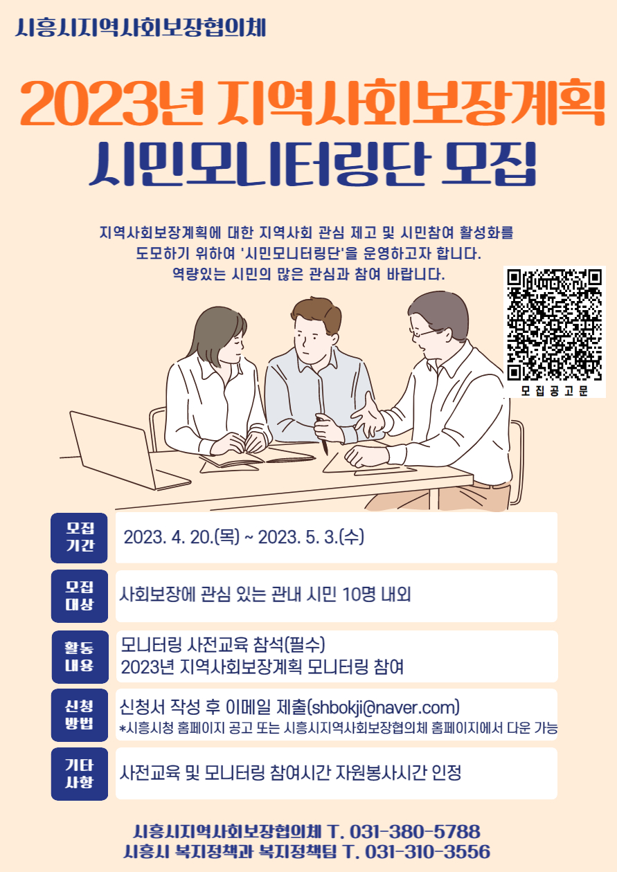 시흥시 지역사회보장협의체(민간위원장 고일웅, 공공위원장 임병택)가 4월 20일부터 5월 3일까지 약 2주간 제5기(2023~2026) 지역사회보장계획의 2023년 연차별 시행계획 시민 모니터링단을 모집한다.